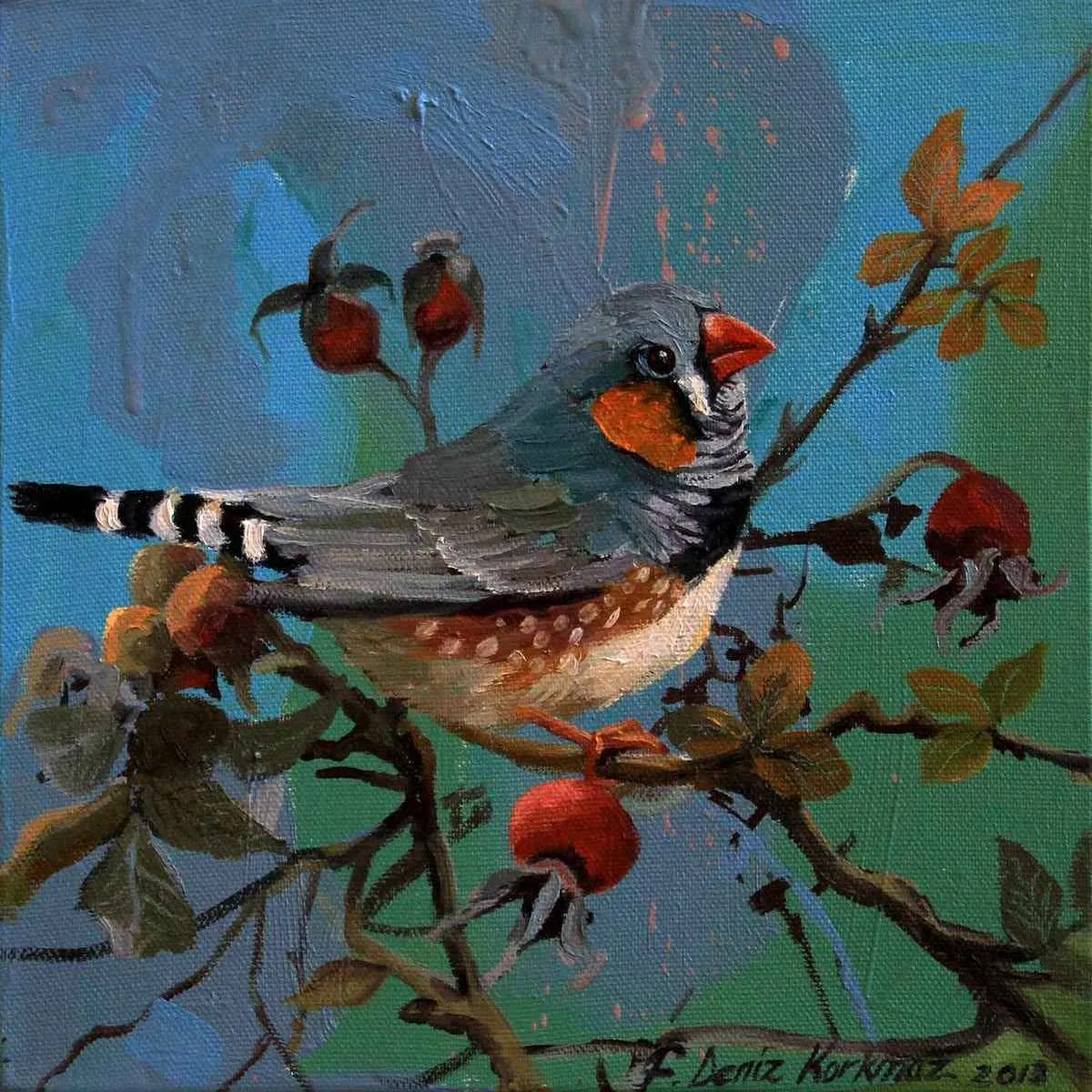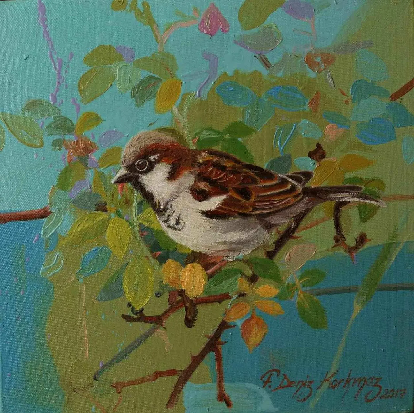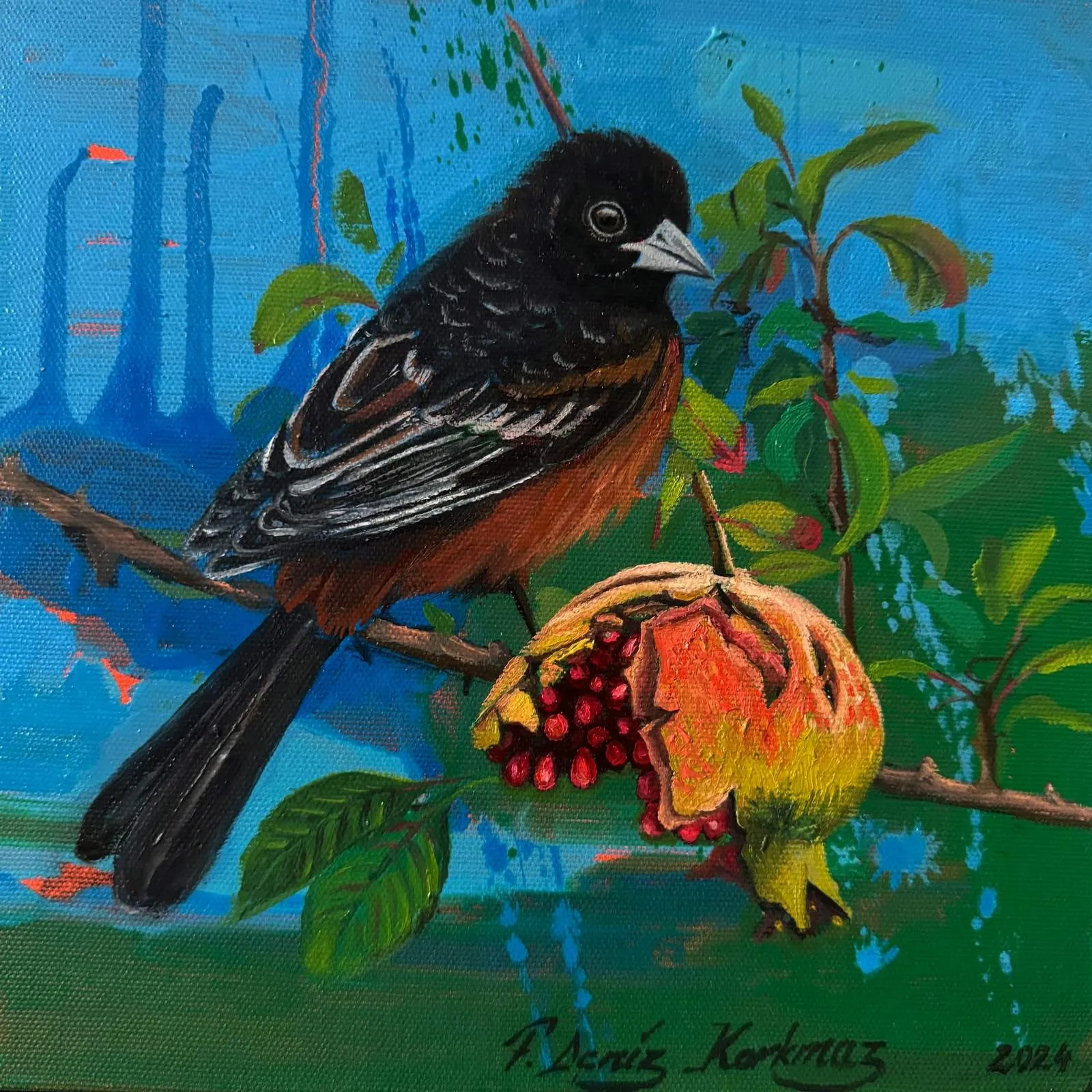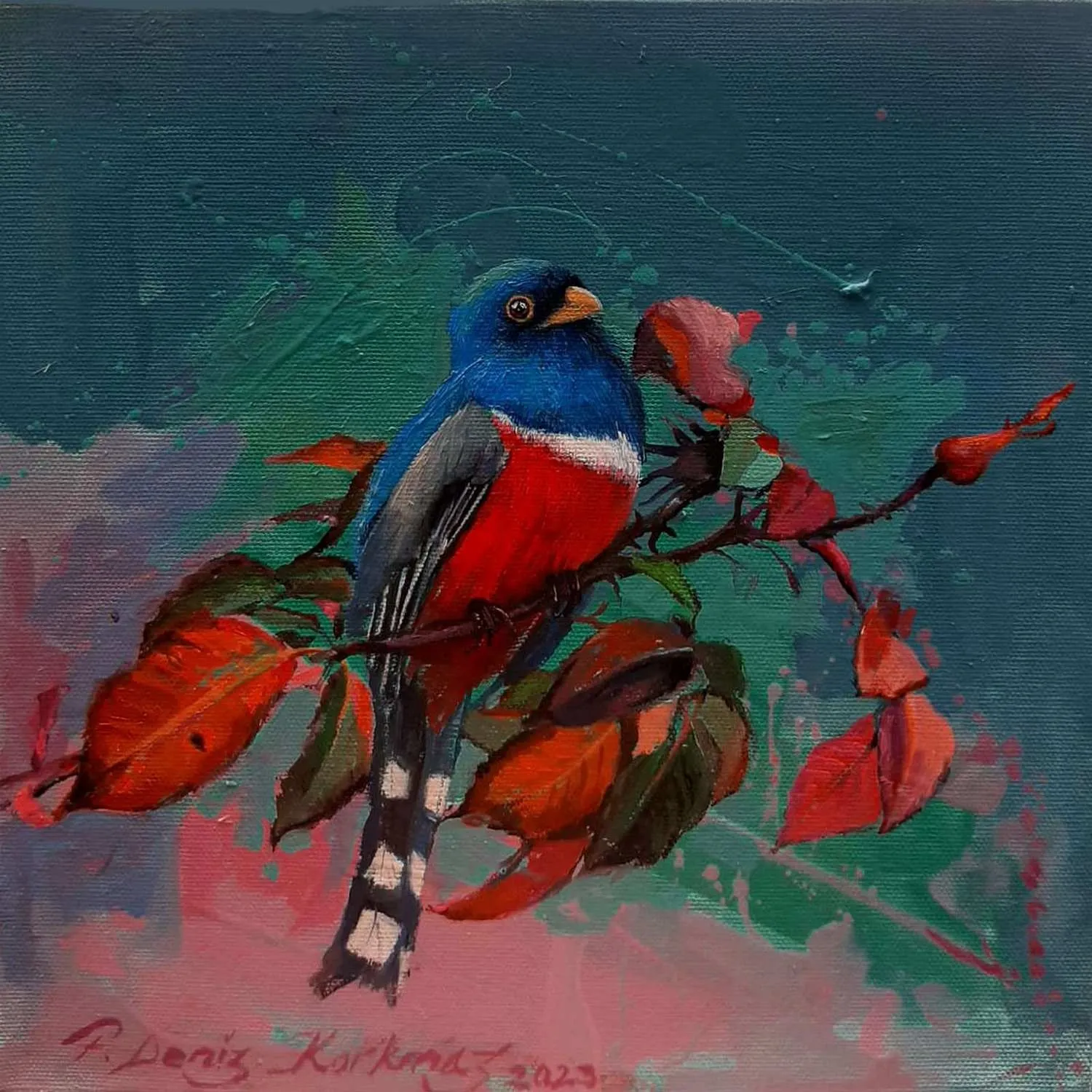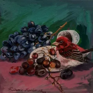 2003 yılında, Atatürk Üniversitesi, Güzel Sanatlar Fakültesi, Resim Bölümü’nü fakülte birincisi olarak bitirdi. 2006 yılında aynı üniversitenin Sosyal Bilimler Enstitüsü, Resim Bölümü, Yüksek Lisans Programını “Eleştiri Kuramı Olarak Feminizm ve Sanata Yansımaları: Feminist Sanat” adlı tezini vererek tamamladı. 2010 yılında ise, Mimar Sinan Güzel Sanatlar Üniversitesi, Resim Bölümü, Sanatta Yeterlik Programını “Dada’dan Günümüze Plastik Sanatlarda Anti-Estetik Form Olarak Beden” adlı tezini vererek bitirmiştir. 2014 yılında Doçent, 2019 yılında Profesör unvanı alan Korkmaz, halen Eskişehir Osmangazi Üniversitesi, Sanat ve Tasarım Fakültesi, Görsel Sanatlar Bölümü’nde öğretim üyesi ve Bölüm Başkanı olarak çalışmaktadır. Yurt içinde 6, yurt dışında 4 olmak üzere toplam 10 kişisel sergi açmış, sempozyum ve workshoplara katılmış, resimleri çok sayıda ulusal ve uluslar arası karma ve yarışmalı sergilerde ve müzayedelerde yer almıştır. Ayrıca resmi kurum ve kuruluşların yanı sıra özel koleksiyonlarda birçok çalışması bulunan Korkmaz’ın resim yarışmalarından ve kurumlardan elde edilmiş altı ödülü bulunmaktadır. F. Deniz Korkmaz, figürün farklı anlamlar yarattığı çok katmanlı yapıdan beslenmektedir. Yapıtın varlığının neden olduğu kavramsal bağlamdaki heterojen yapı, yeni sorgulamalara ve açılımlara iten sebeplerden biridir. Korkmaz’ın sanatsal sorunsallarının esasını oluşturan nedenler ise; farkında olunmayan ya da kanıksanan, alelade diye tanımlanan oluşlara yeni bir biçimde bakabilme, aynı ya da farklı cinsler arasındaki sözlü ya da sözsüz “ben” diyaloglarına, iki boyutlu düzlemde, sorulması ötelenen şeyleri sorulabilir kılma ve kimi zaman malzemenin olanaklarıyla sözden arınmış cevaplar verebilme yönündedir. Korkmaz’ın sanat geçmişinin başlangıcından itibaren ana bağlamı olan figüratif anlatımı, son yıllarda doğa teması üzerine yoğunlaşarak çeşitlenmeye başlamıştır. Yürütücüsü olduğu Eskişehir, Bursa, Bilecik illeri ve civarlarında görülen kuş türleri üzerine yapılan bilimsel ve aynı zamanda sanatsal bir projeden dolayı şehirlerde yaşayan kuş türleri üzerine odaklanmıştır. Etrafımızda varlıklarını çoğunlukla fark edemediğimiz küçük kuşların yanı sıra şehirlere sıkışmış bitki türleri, uyumlu bir birliktelikle sanatın dışavurumcu olanakları içerisinde yeniden tasvir edilmiştir. Bitki ve kuş türlerinin yanı sıra nihayetinde insan figürleriyle çeşitlenen, fantastik bir kurgu içerisinde, soyut dışavurumcu arka plan eşliğinde, büyük ebatlı figür çalışmalarında ise, beden, kimlik, cinsiyet, iktidar kavramlarını sembolik biçimlerde sunarak bu kavramlar üzerinden her türlü otoriteye dolaylı eleştiriler getirmektedir.