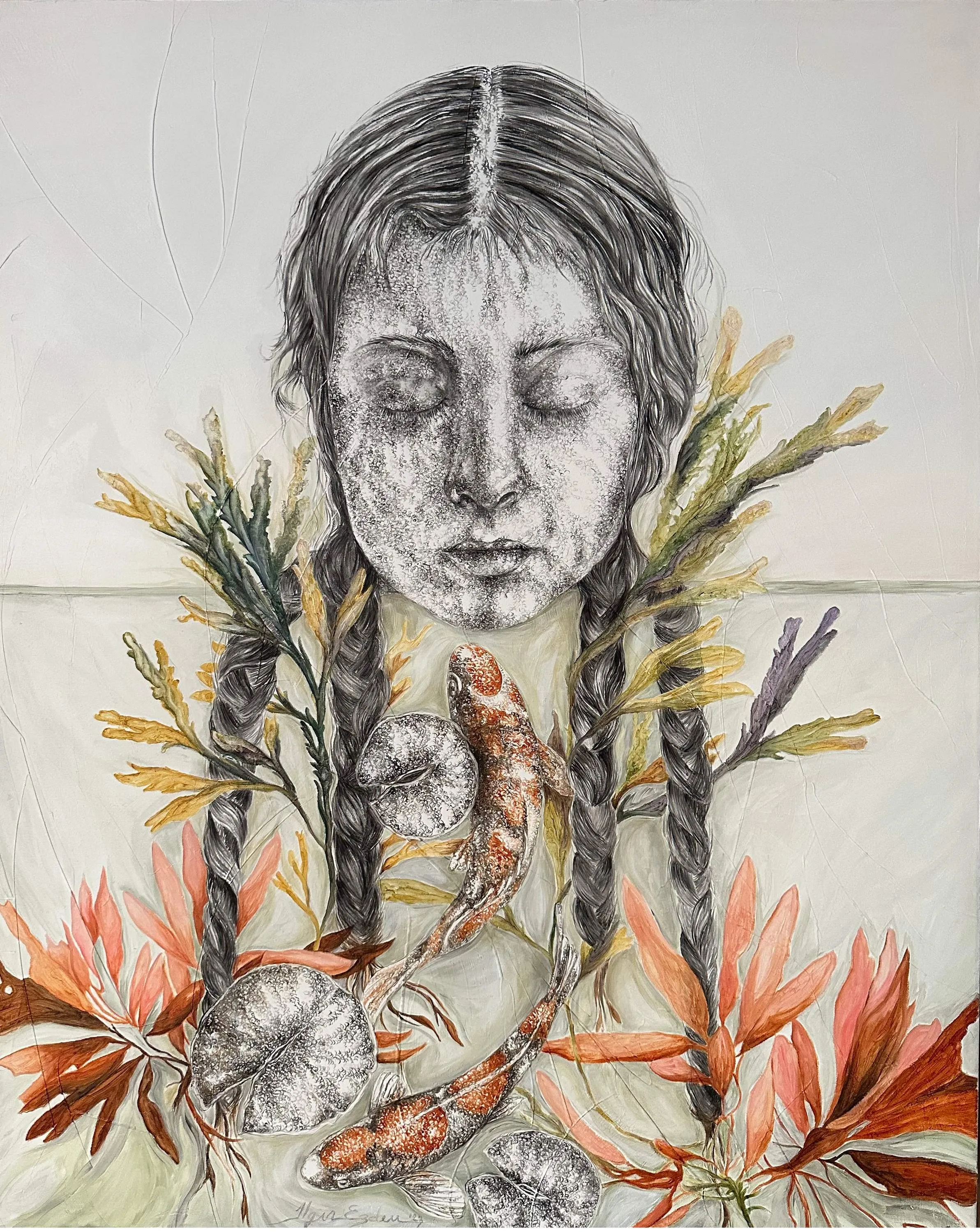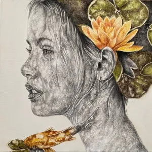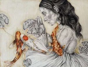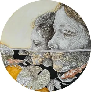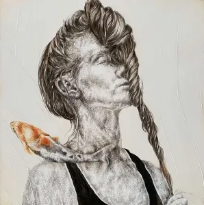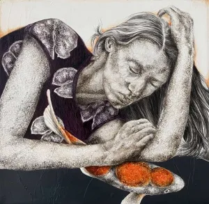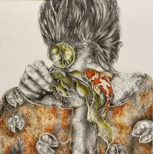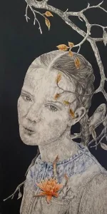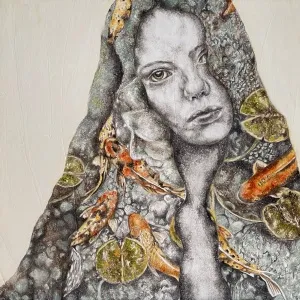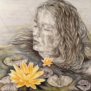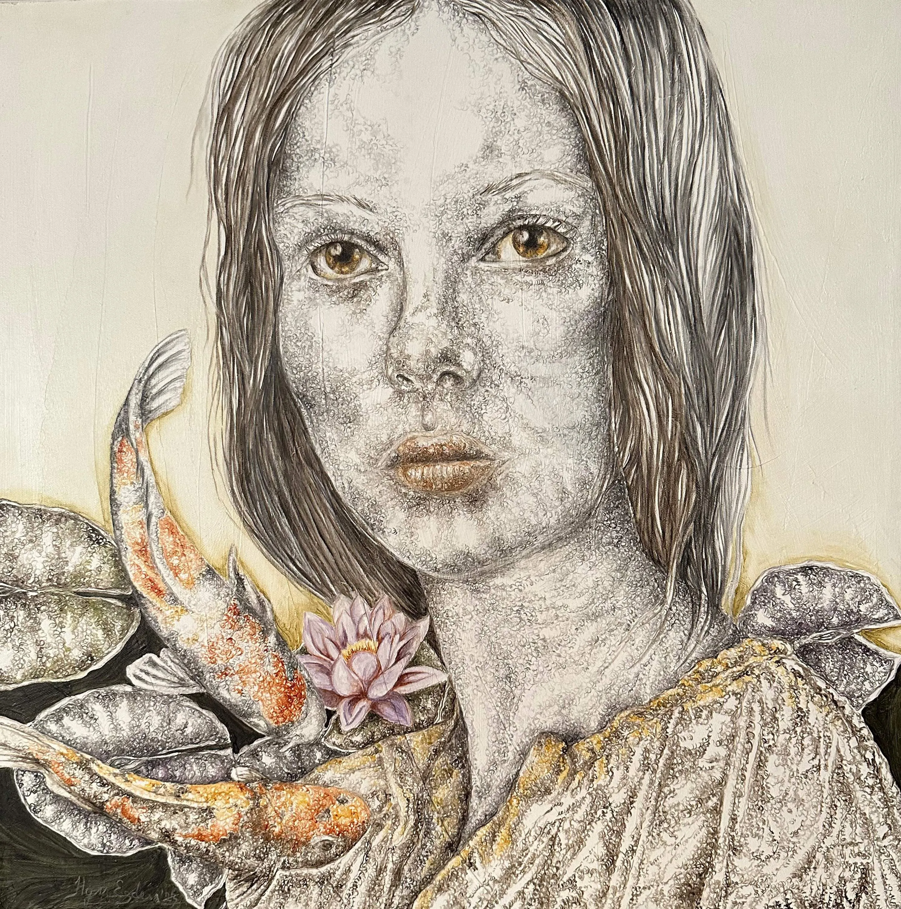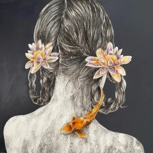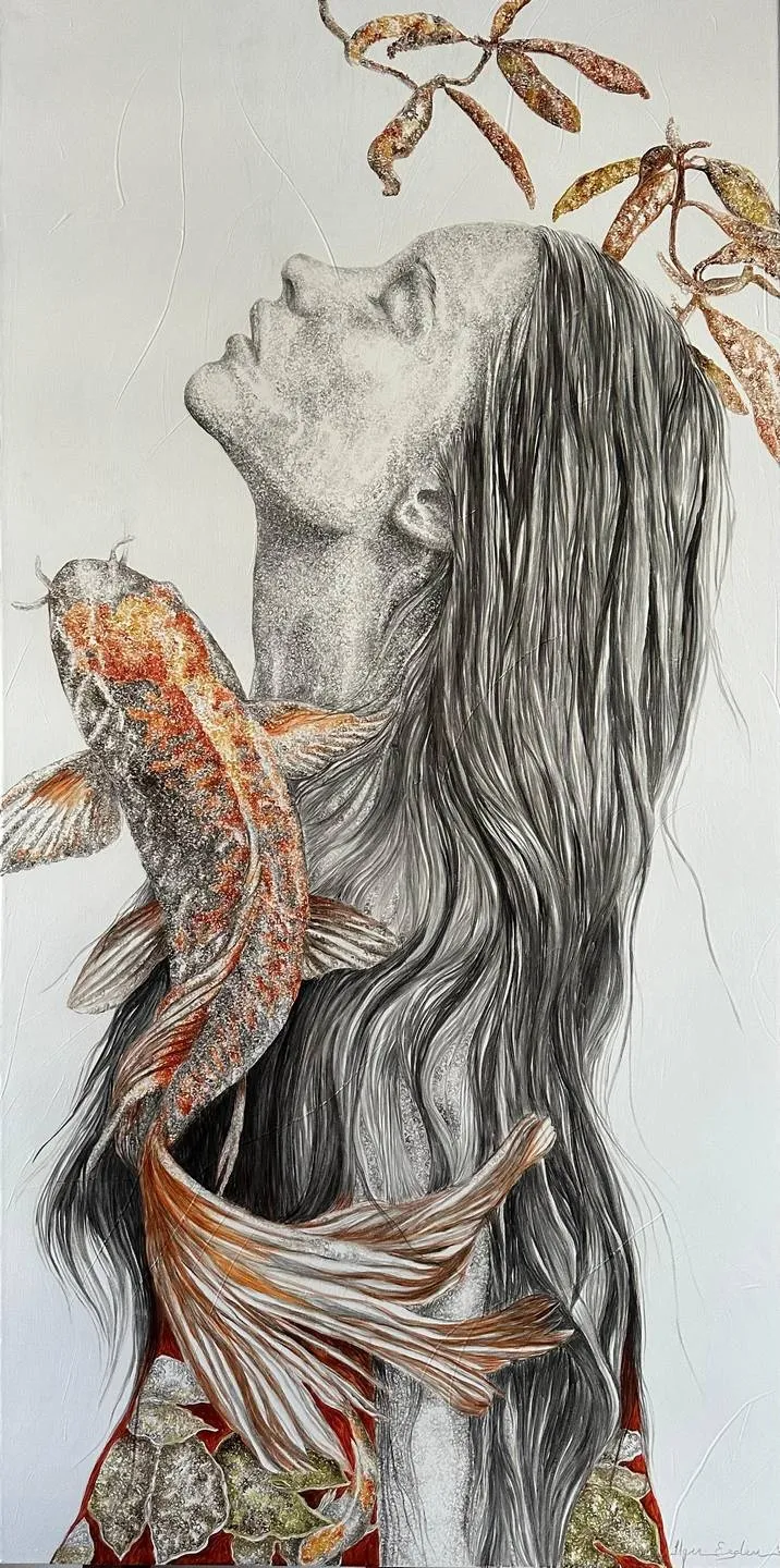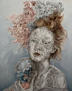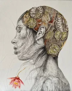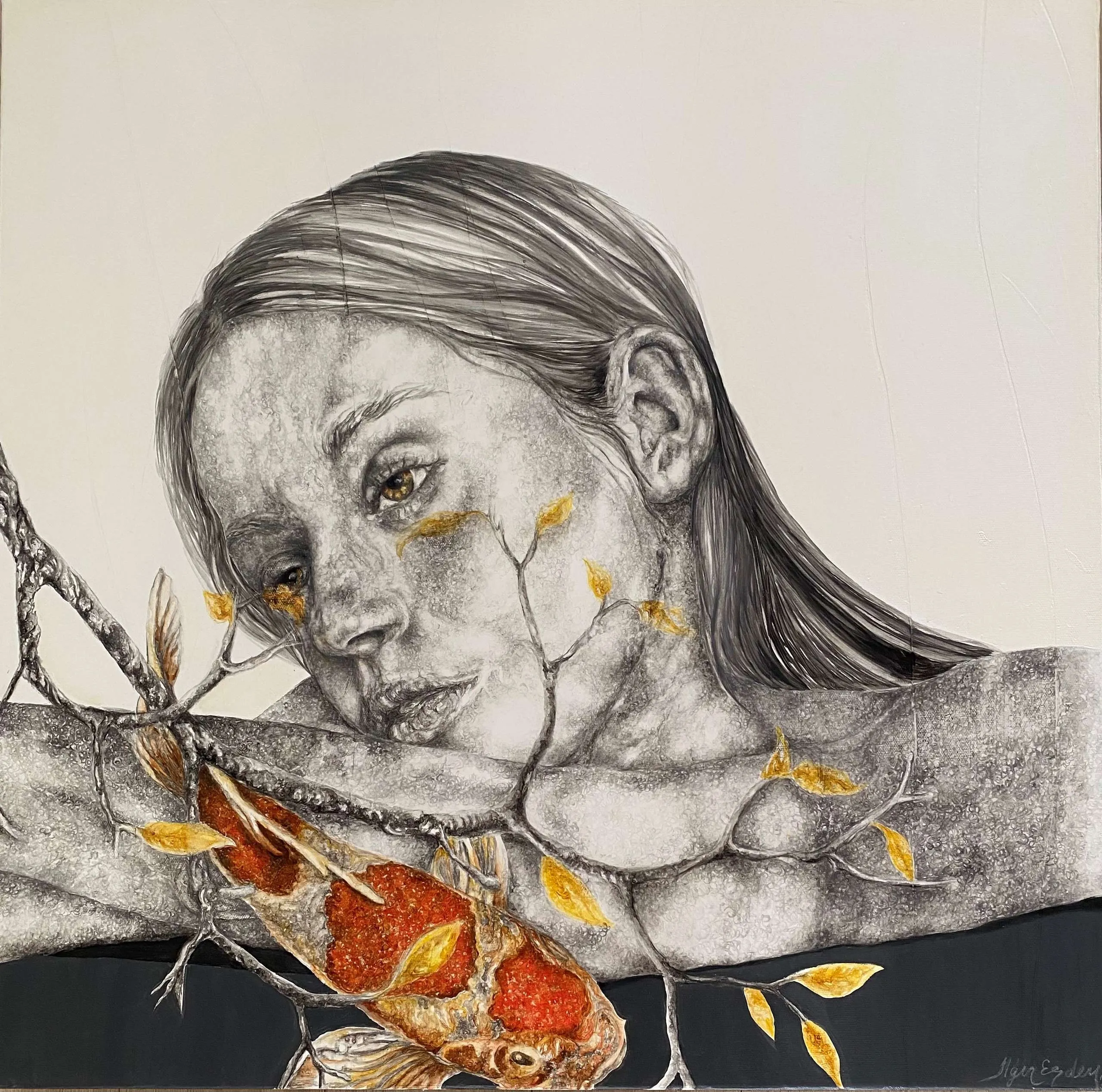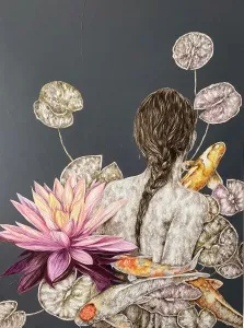 ‘Only through form and pattern… As if moving within its own tranquility, silence can be reached.’ As TS Eliot says, Ilgın Erdem’s figures also reach a quiet stillness, sanctifying innocence and peace, drawing the viewer into the depth within her painting. Her art is full of innocence. She searches for the silence of lost innocence; the silence of silenced women, the stillness between dream and reality. Her women call the viewer into an inner dialogue. Freed from the burdens of the world, they seem to seek inner peace and tranquility through being ‘here and now.’ And their silence is the shadow of the pain in their souls, captured in their expressions.