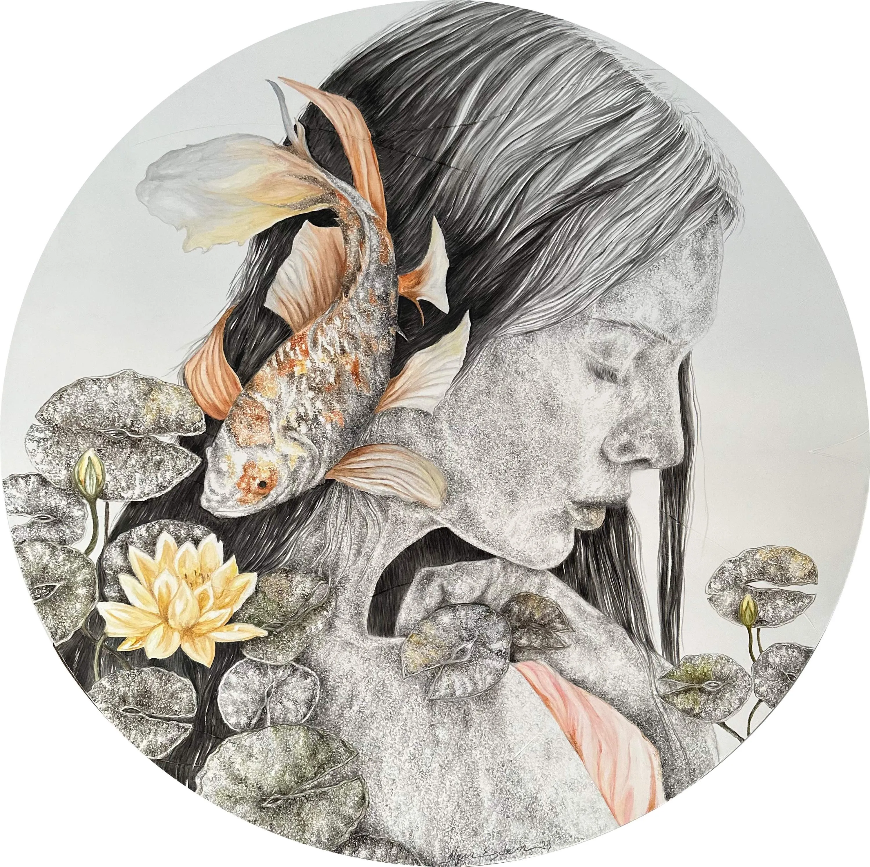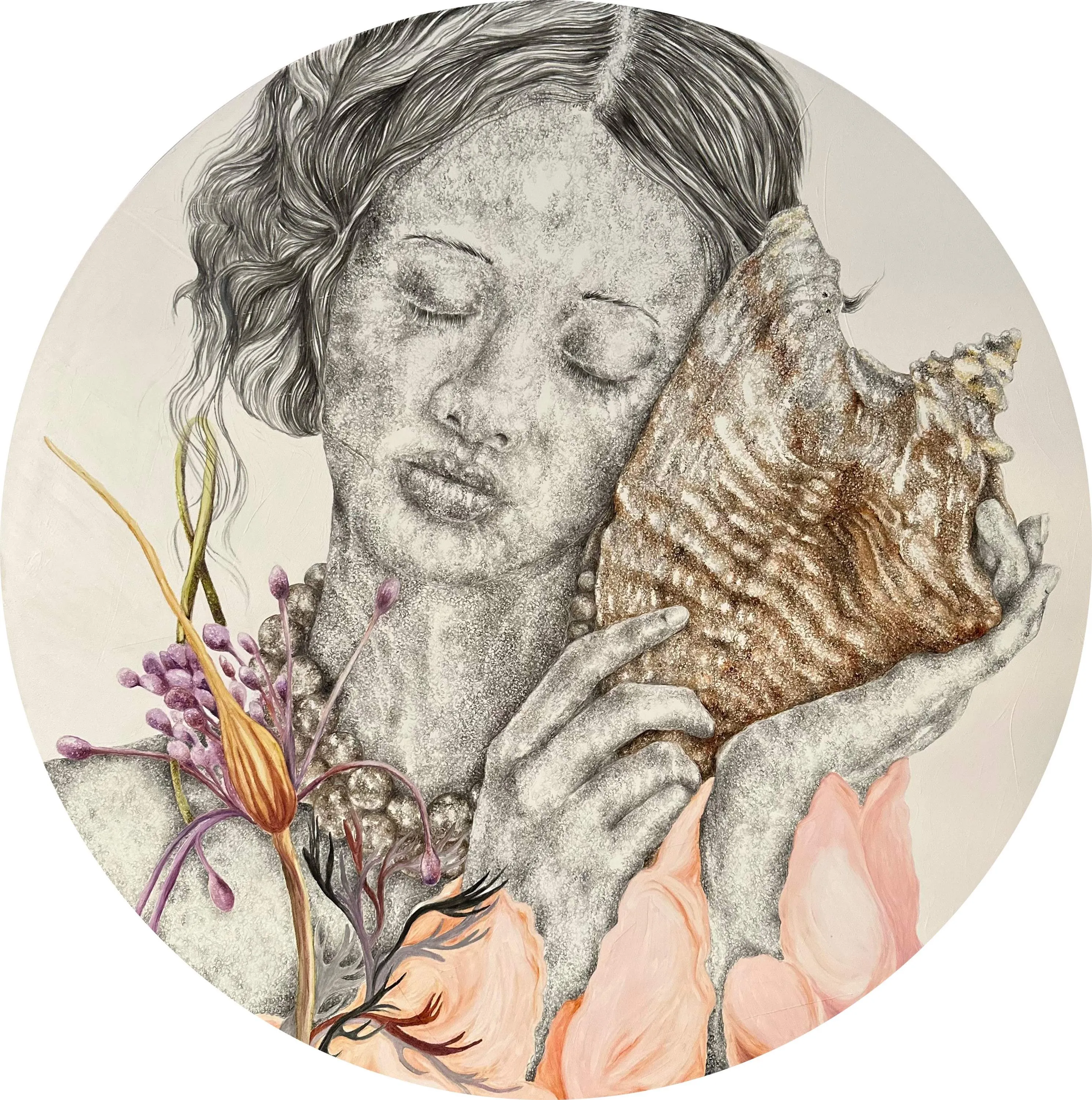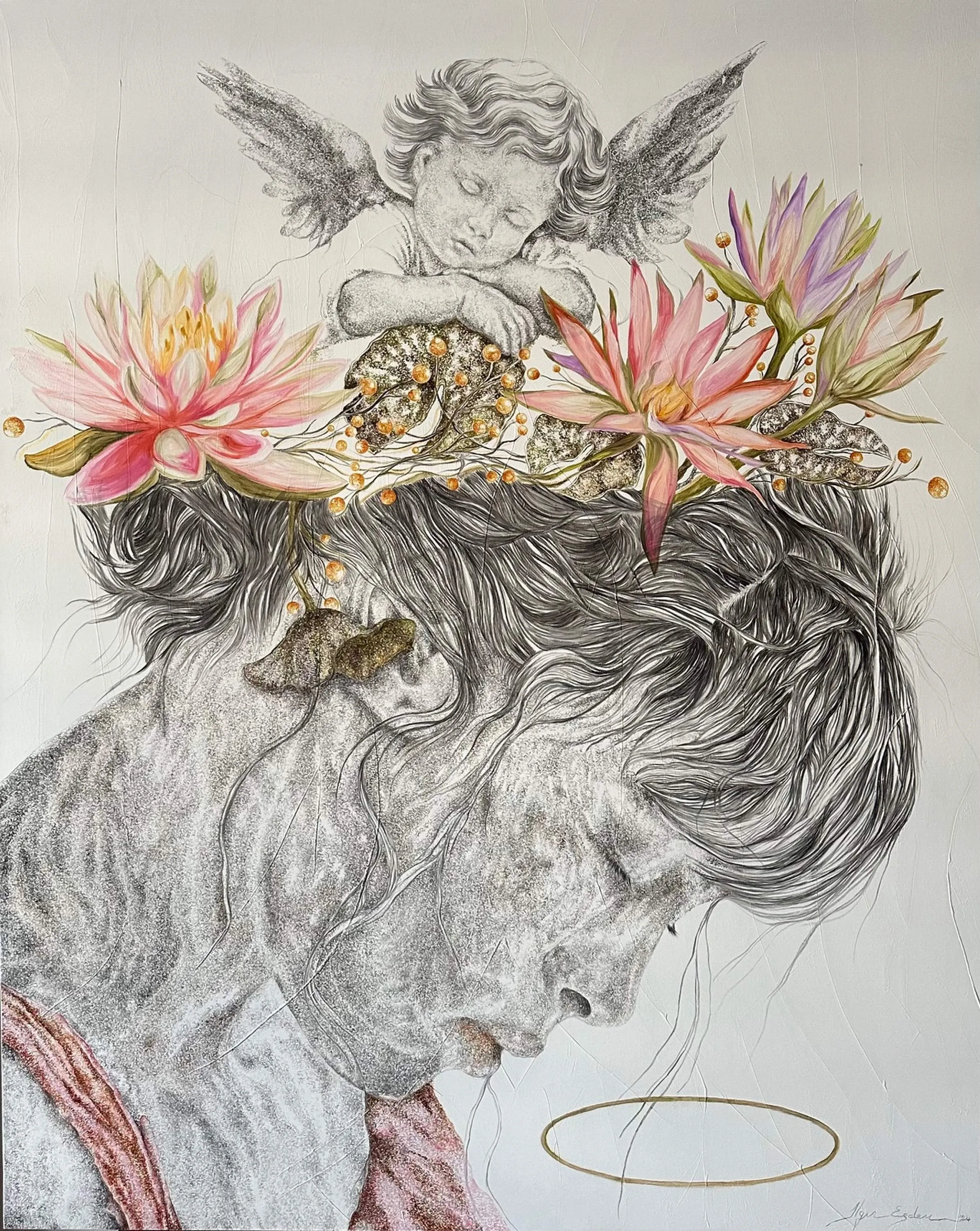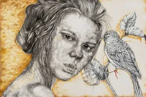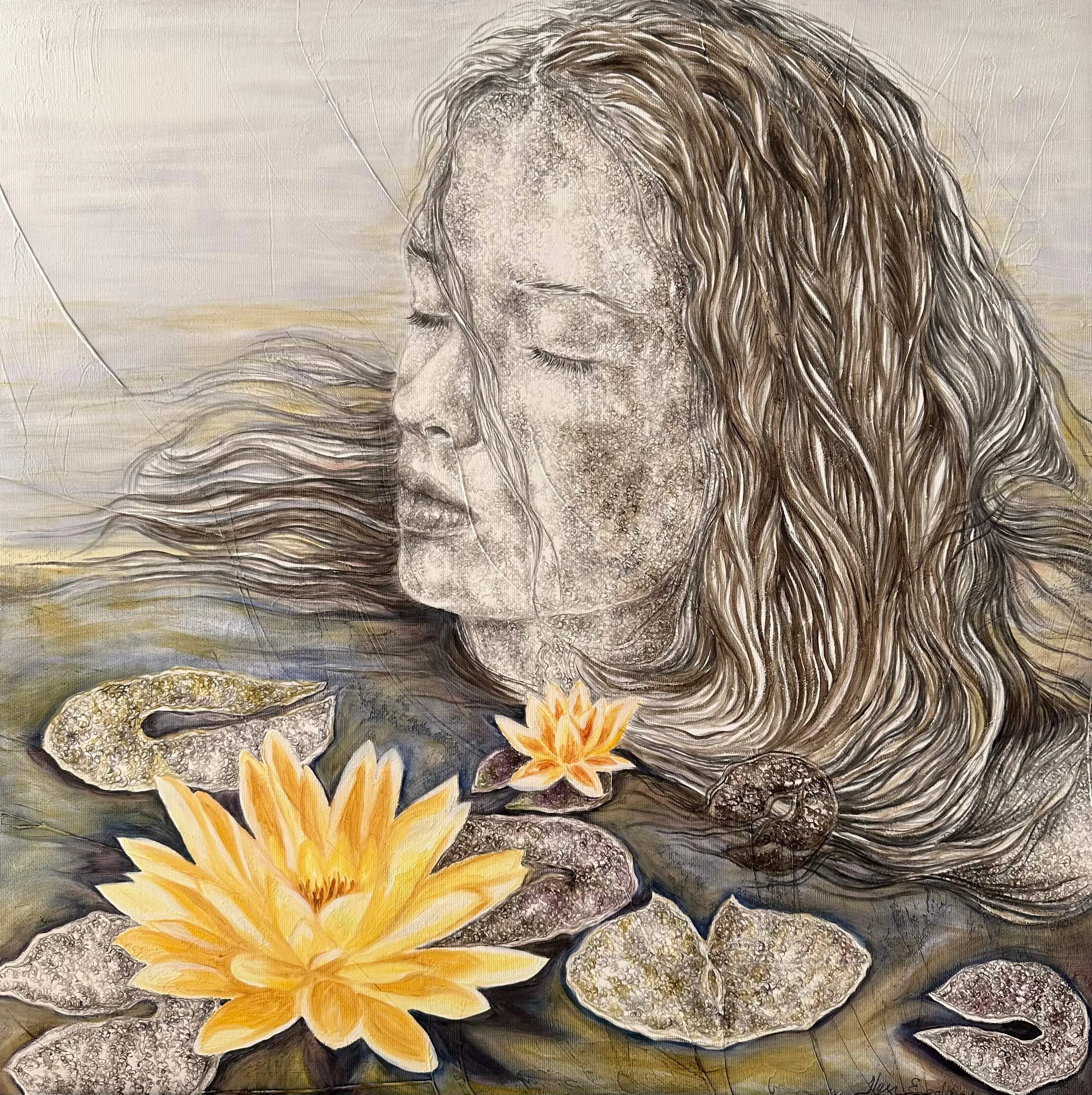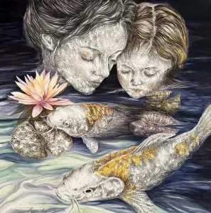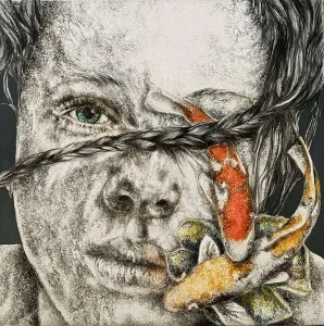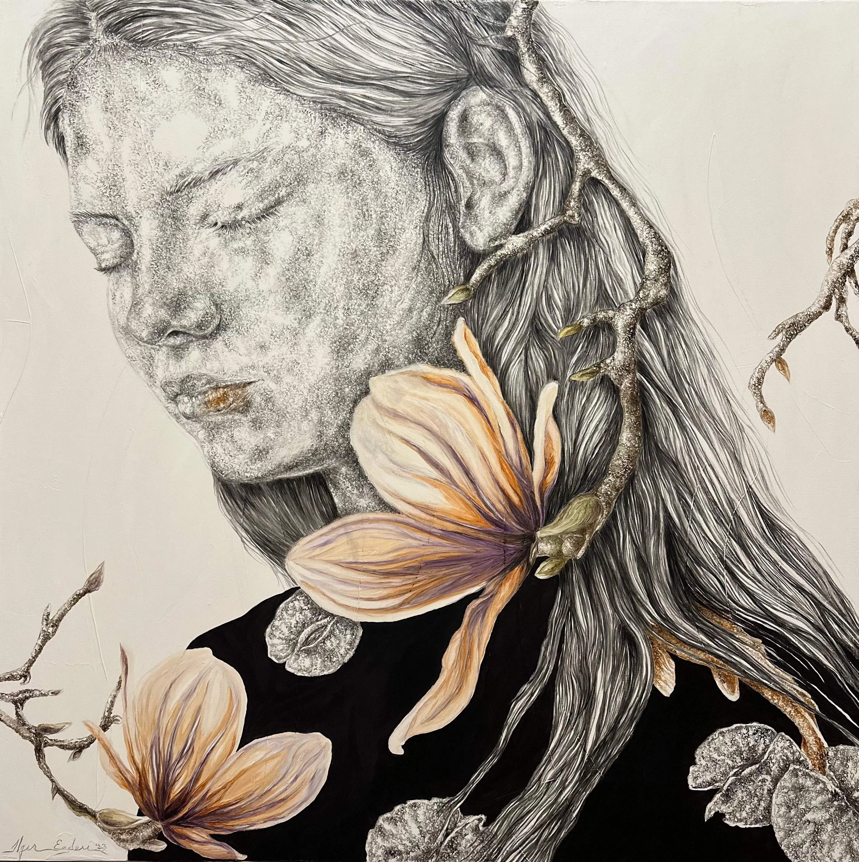 ‘Only through form and pattern… As if moving within its own tranquility, silence can be reached.’ As TS Eliot says, Ilgın Erdem’s figures also reach a quiet stillness, sanctifying innocence and peace, drawing the viewer into the depth within her painting. Her art is full of innocence. She searches for the silence of lost innocence; the silence of silenced women, the stillness between dream and reality. Her women call the viewer into an inner dialogue. Freed from the burdens of the world, they seem to seek inner peace and tranquility through being ‘here and now.’ And their silence is the shadow of the pain in their souls, captured in their expressions.