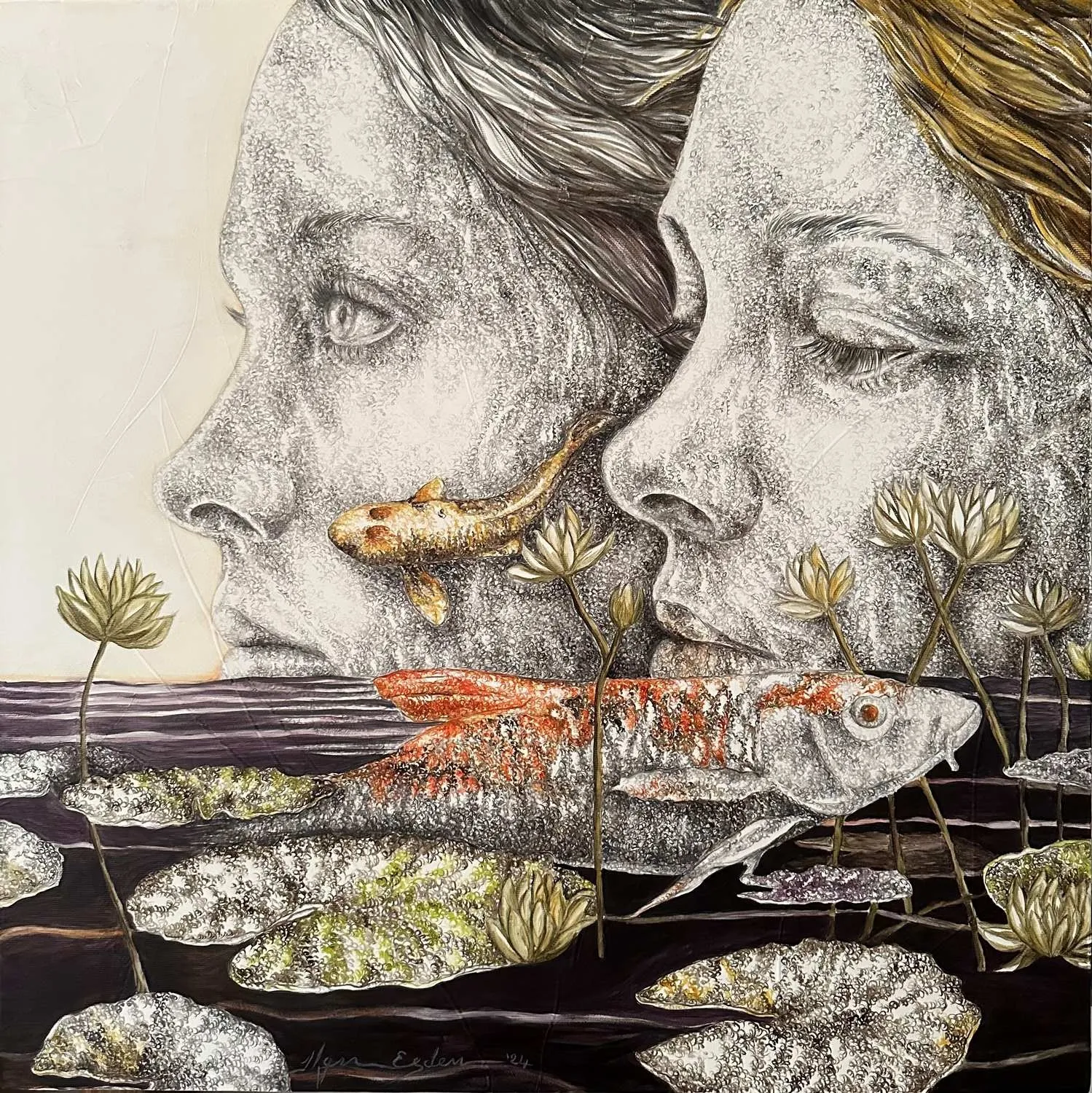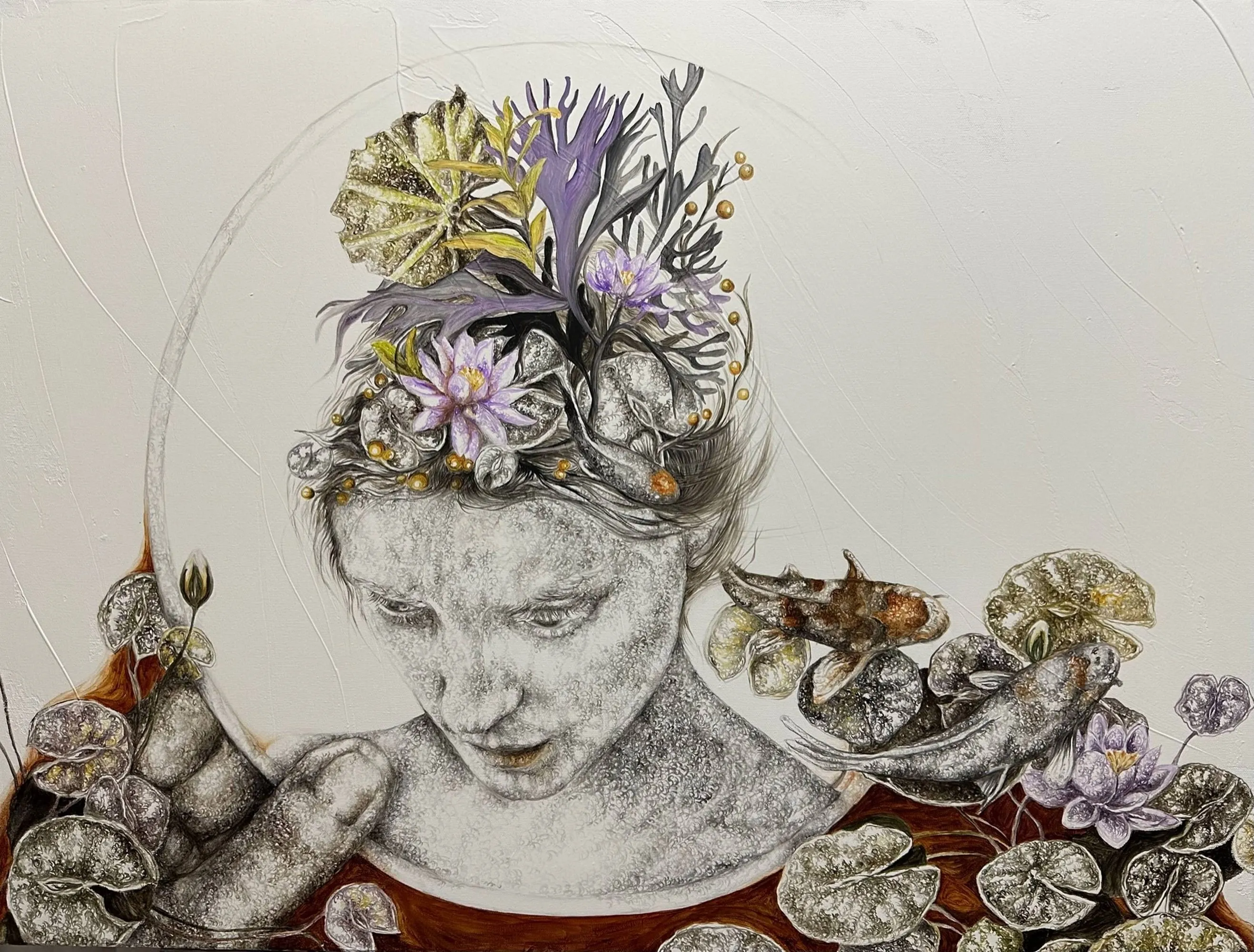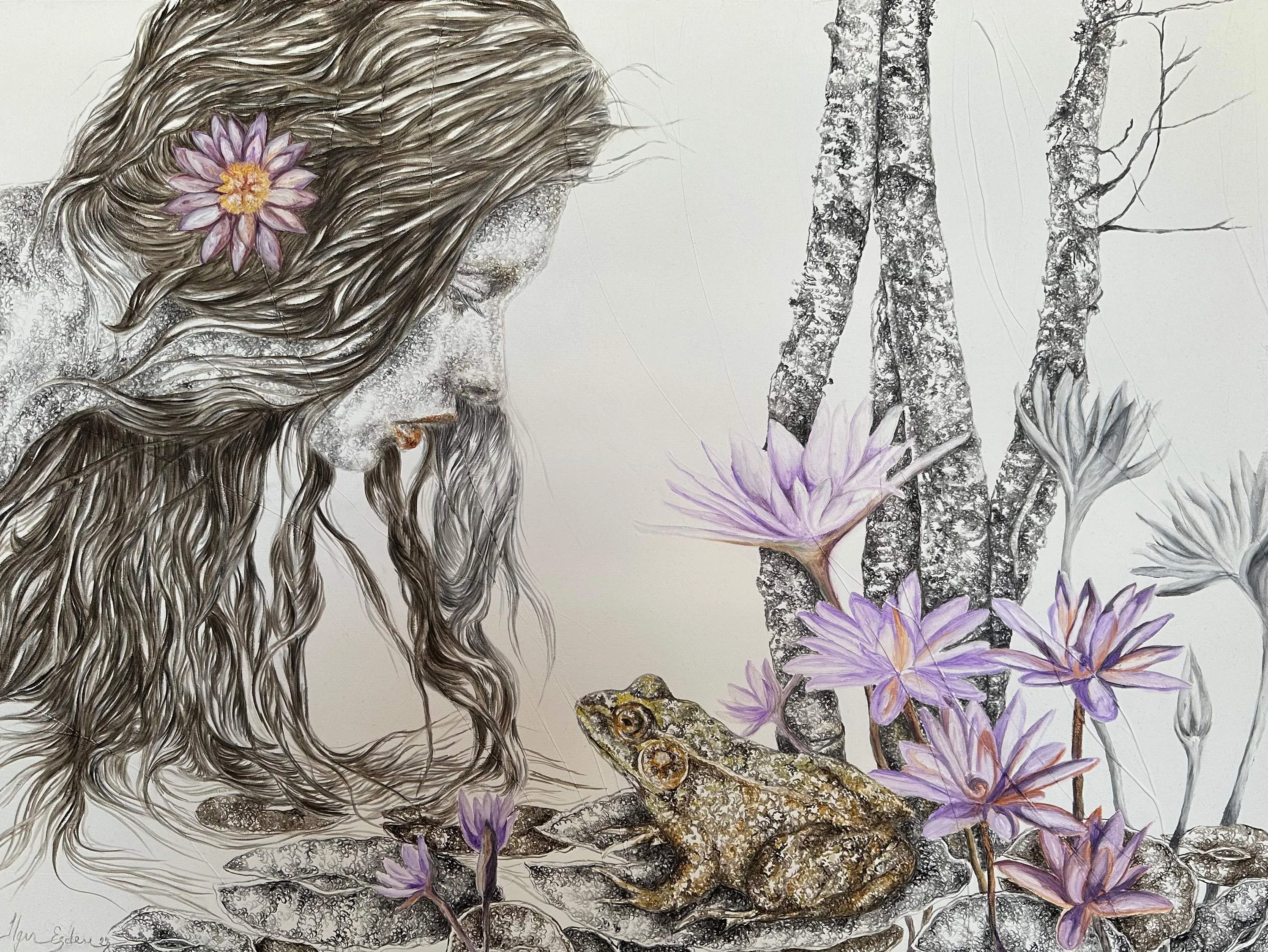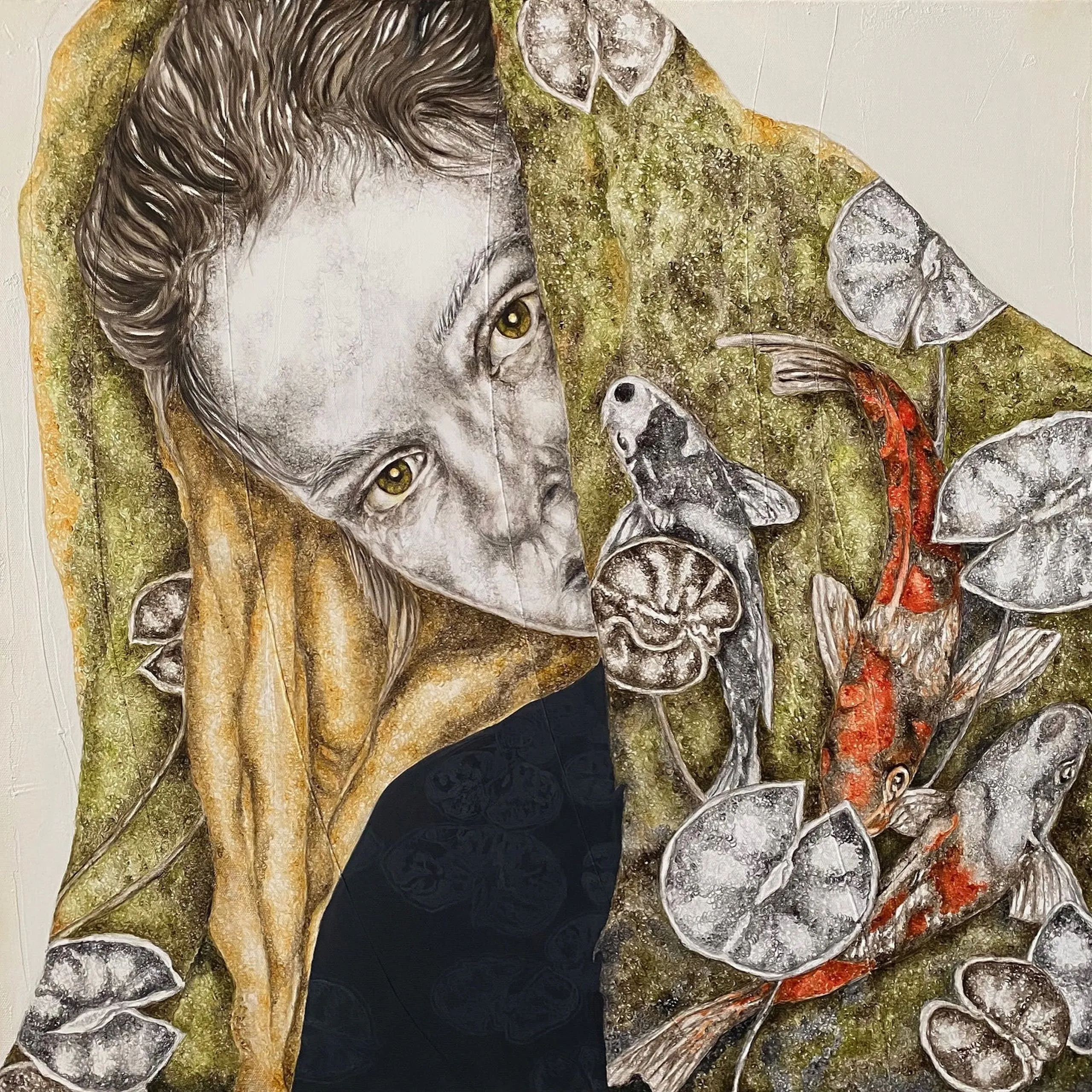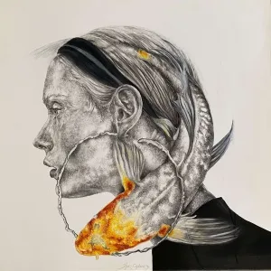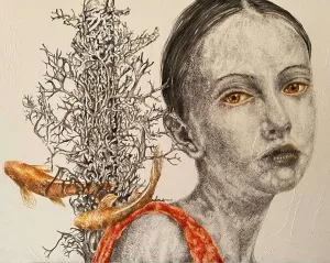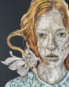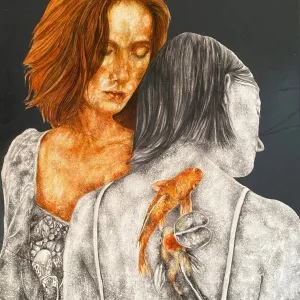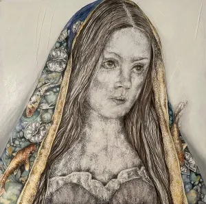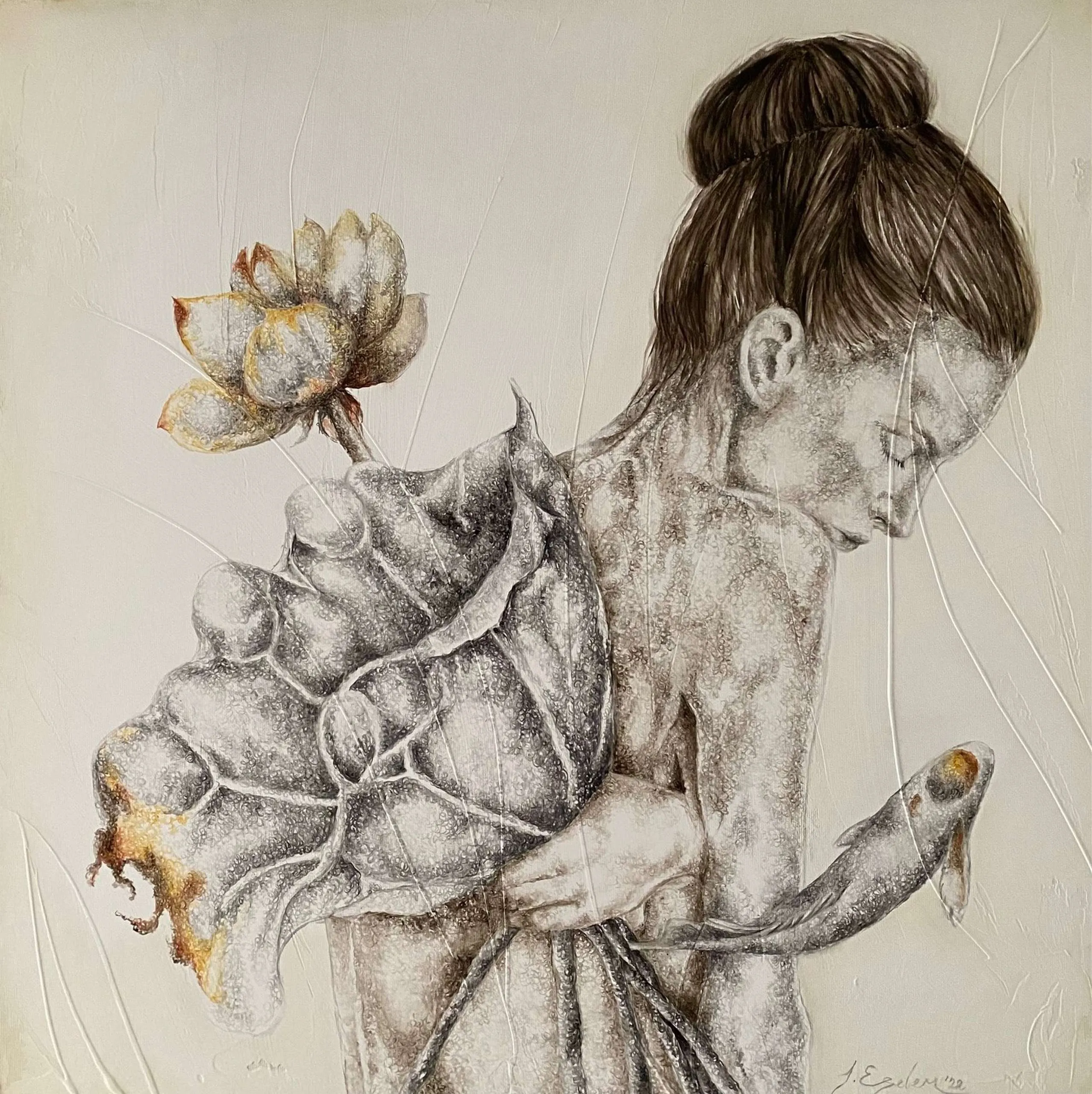 ‘Only through form and pattern… As if moving within its own tranquility, silence can be reached.’ As TS Eliot says, Ilgın Erdem’s figures also reach a quiet stillness, sanctifying innocence and peace, drawing the viewer into the depth within her painting. Her art is full of innocence. She searches for the silence of lost innocence; the silence of silenced women, the stillness between dream and reality. Her women call the viewer into an inner dialogue. Freed from the burdens of the world, they seem to seek inner peace and tranquility through being ‘here and now.’ And their silence is the shadow of the pain in their souls, captured in their expressions.