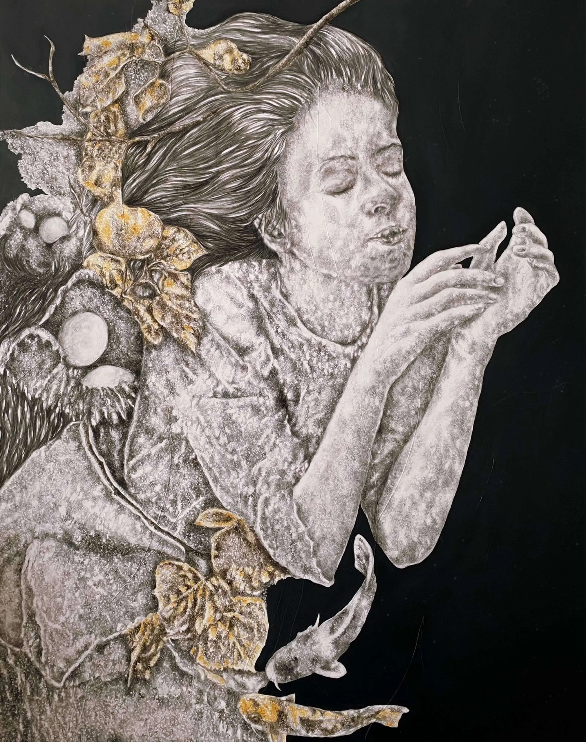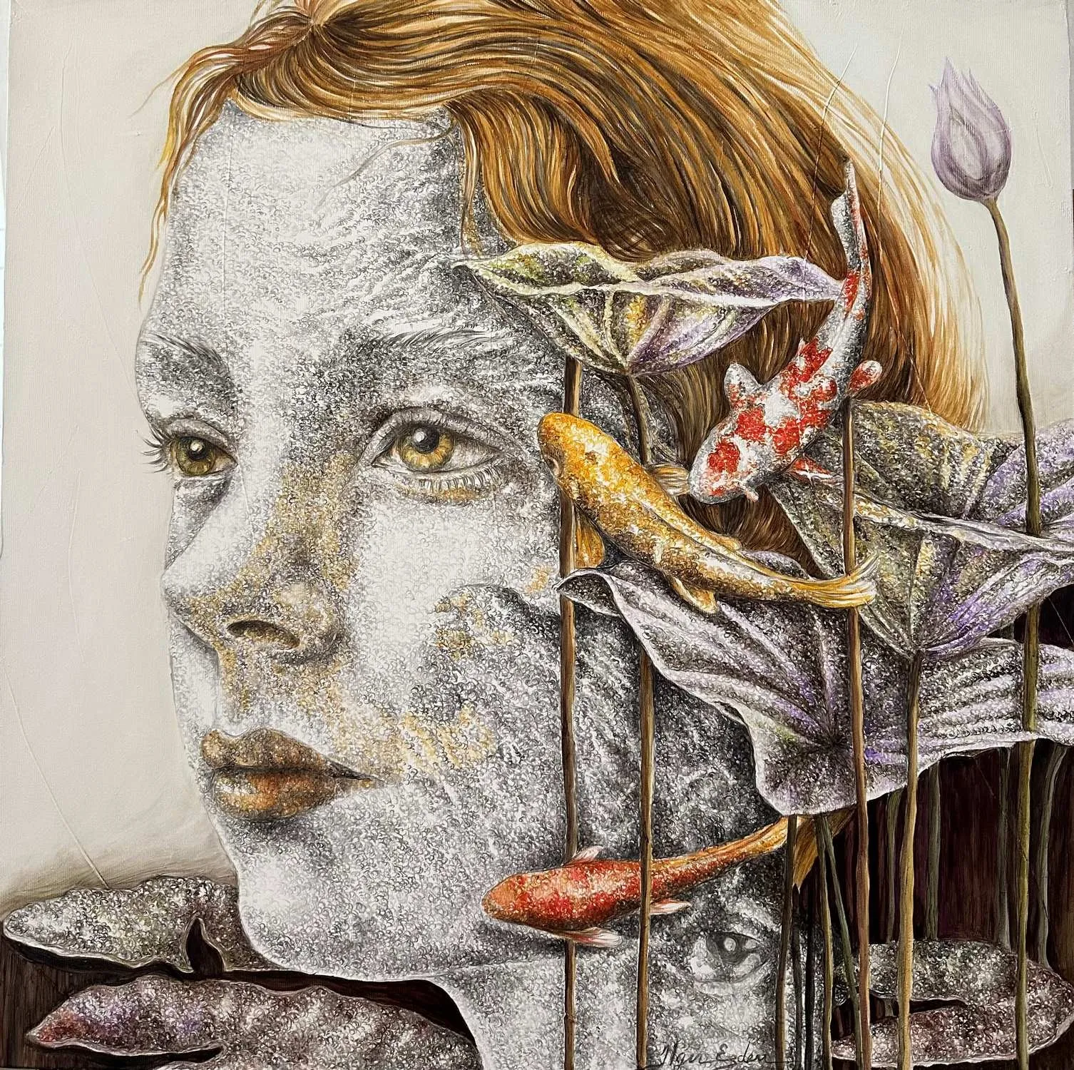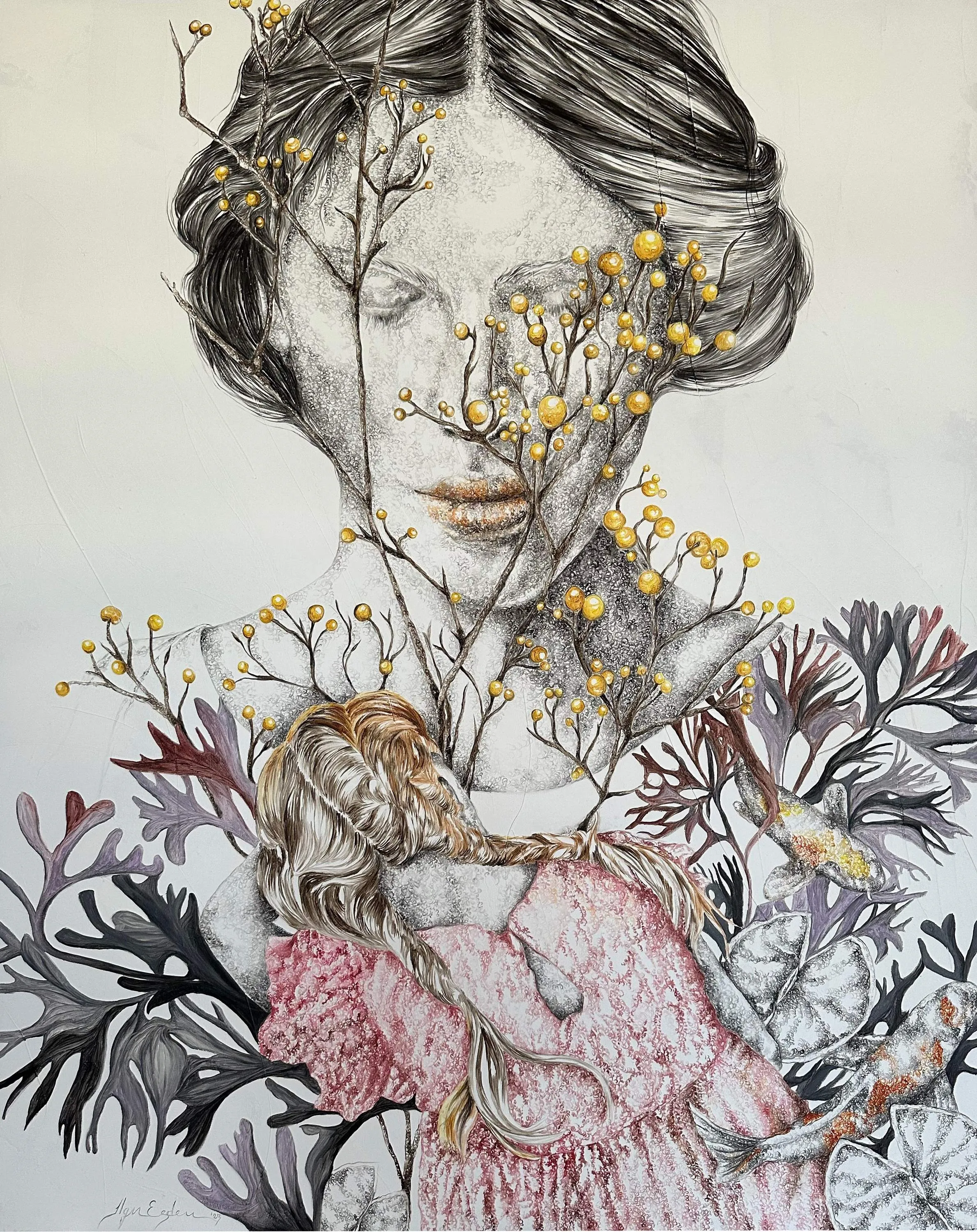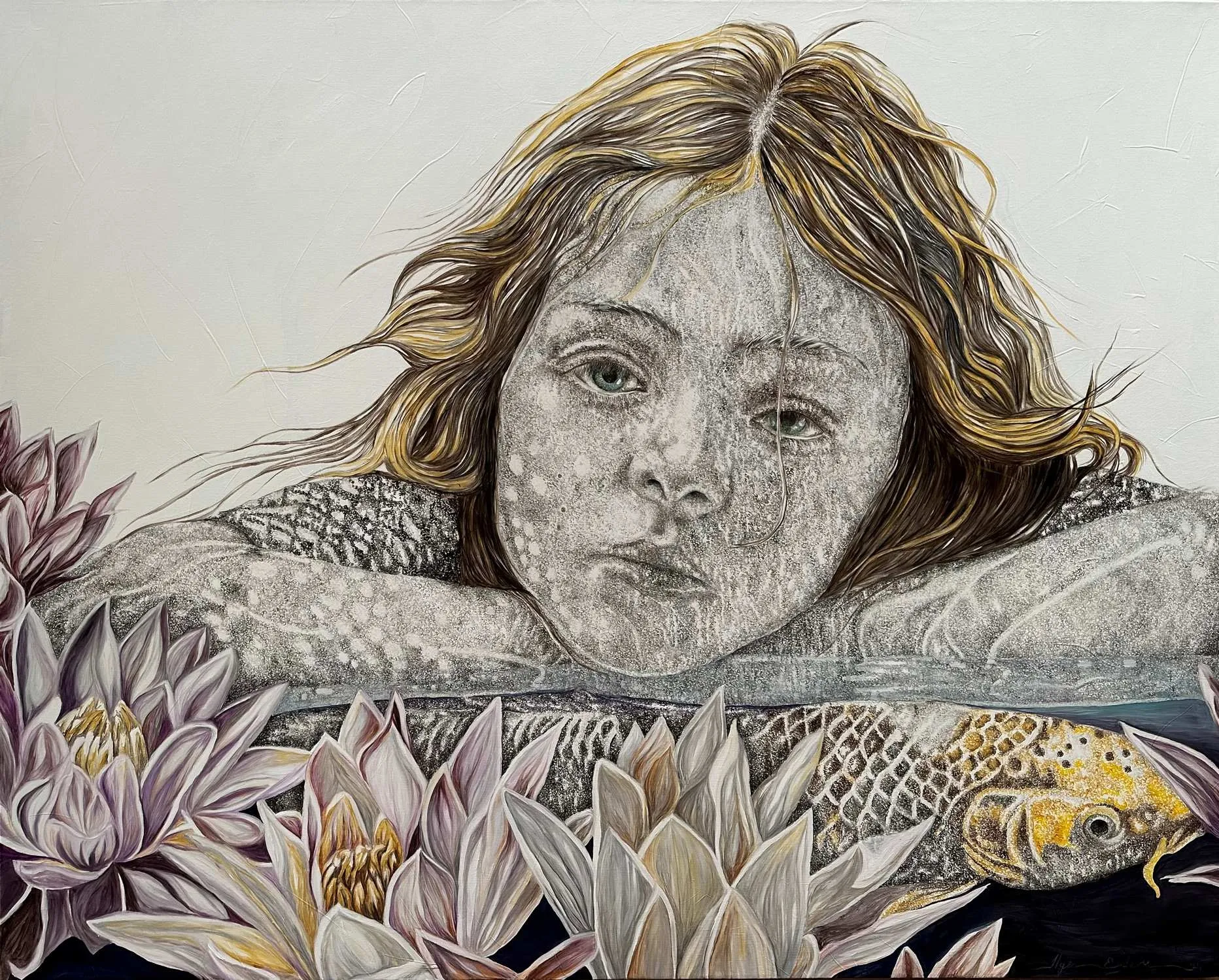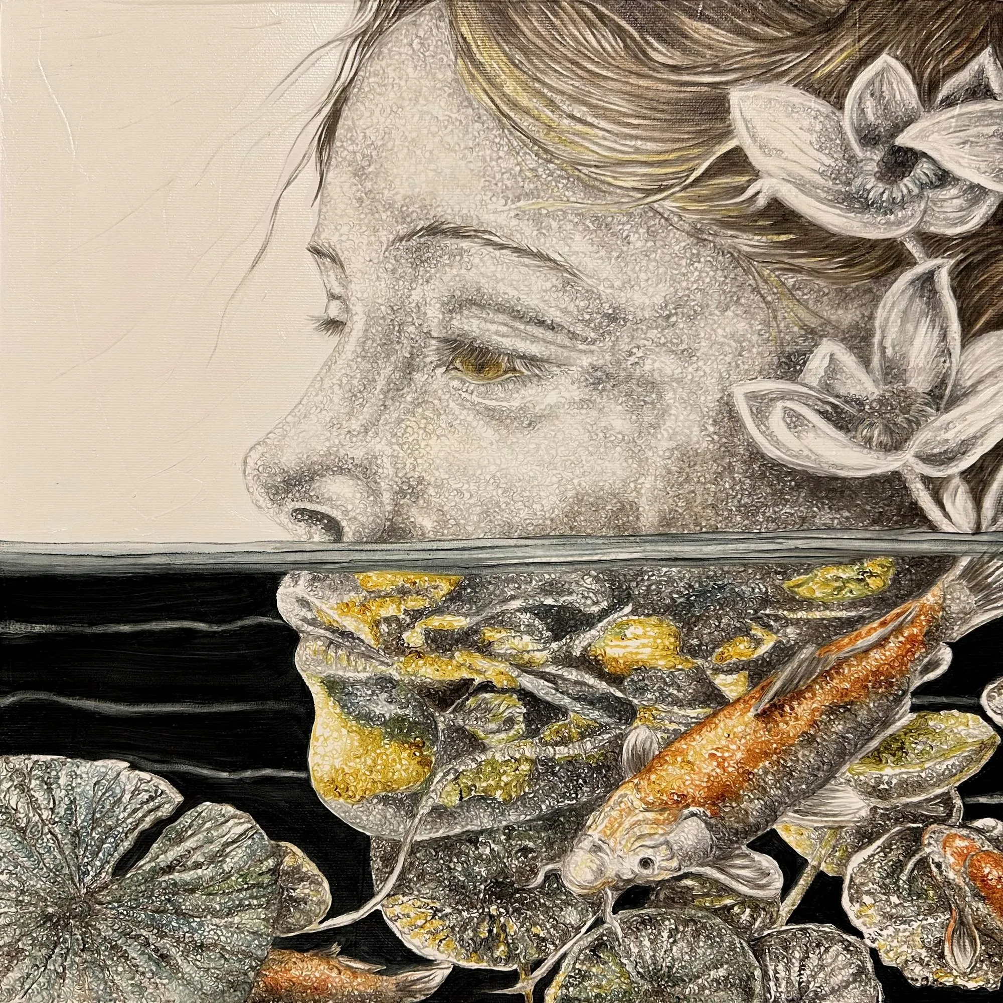 ‘Only through form and pattern… As if moving within its own tranquility, silence can be reached.’ As TS Eliot says, Ilgın Erdem’s figures also reach a quiet stillness, sanctifying innocence and peace, drawing the viewer into the depth within her painting. Her art is full of innocence. She searches for the silence of lost innocence; the silence of silenced women, the stillness between dream and reality. Her women call the viewer into an inner dialogue. Freed from the burdens of the world, they seem to seek inner peace and tranquility through being ‘here and now.’ And their silence is the shadow of the pain in their souls, captured in their expressions.