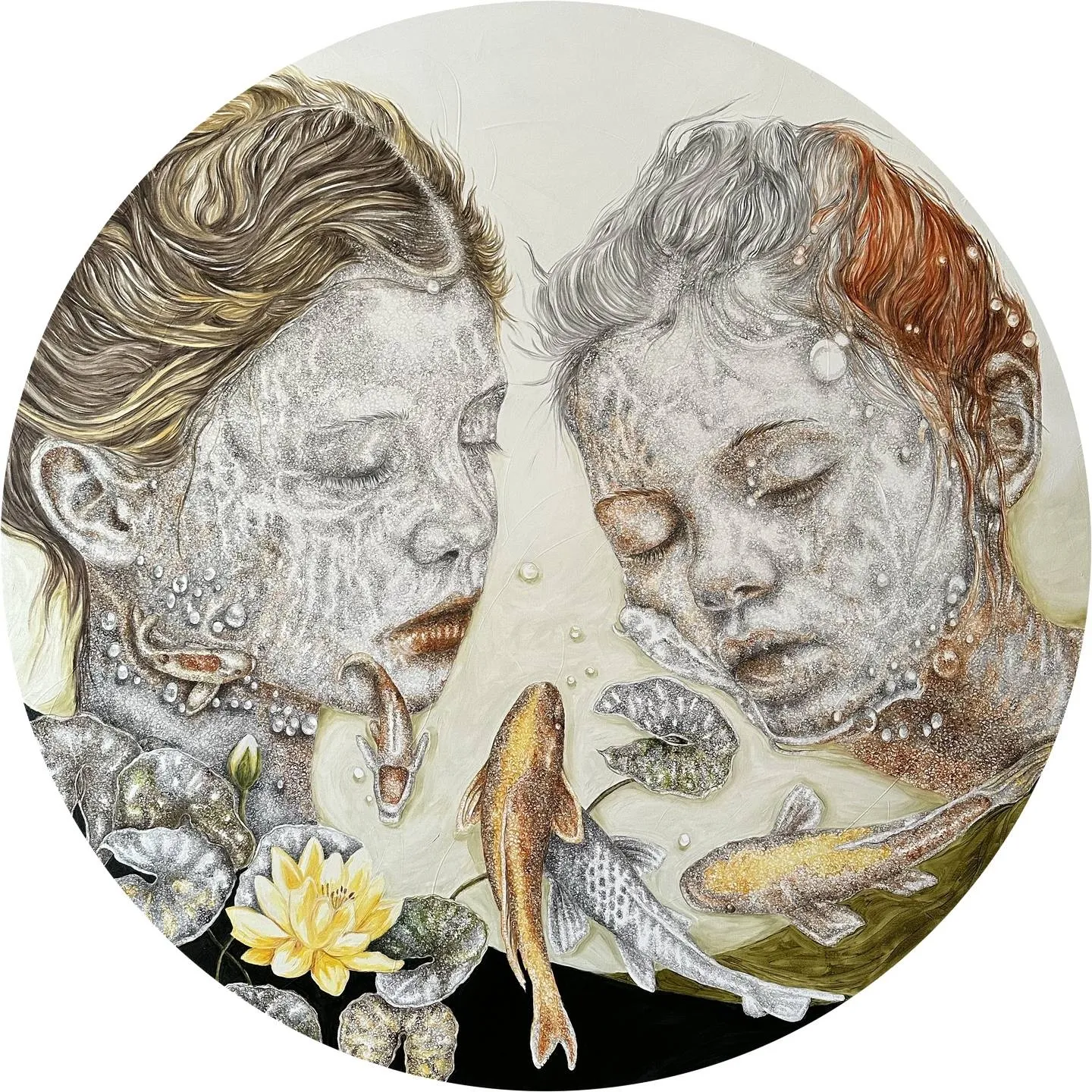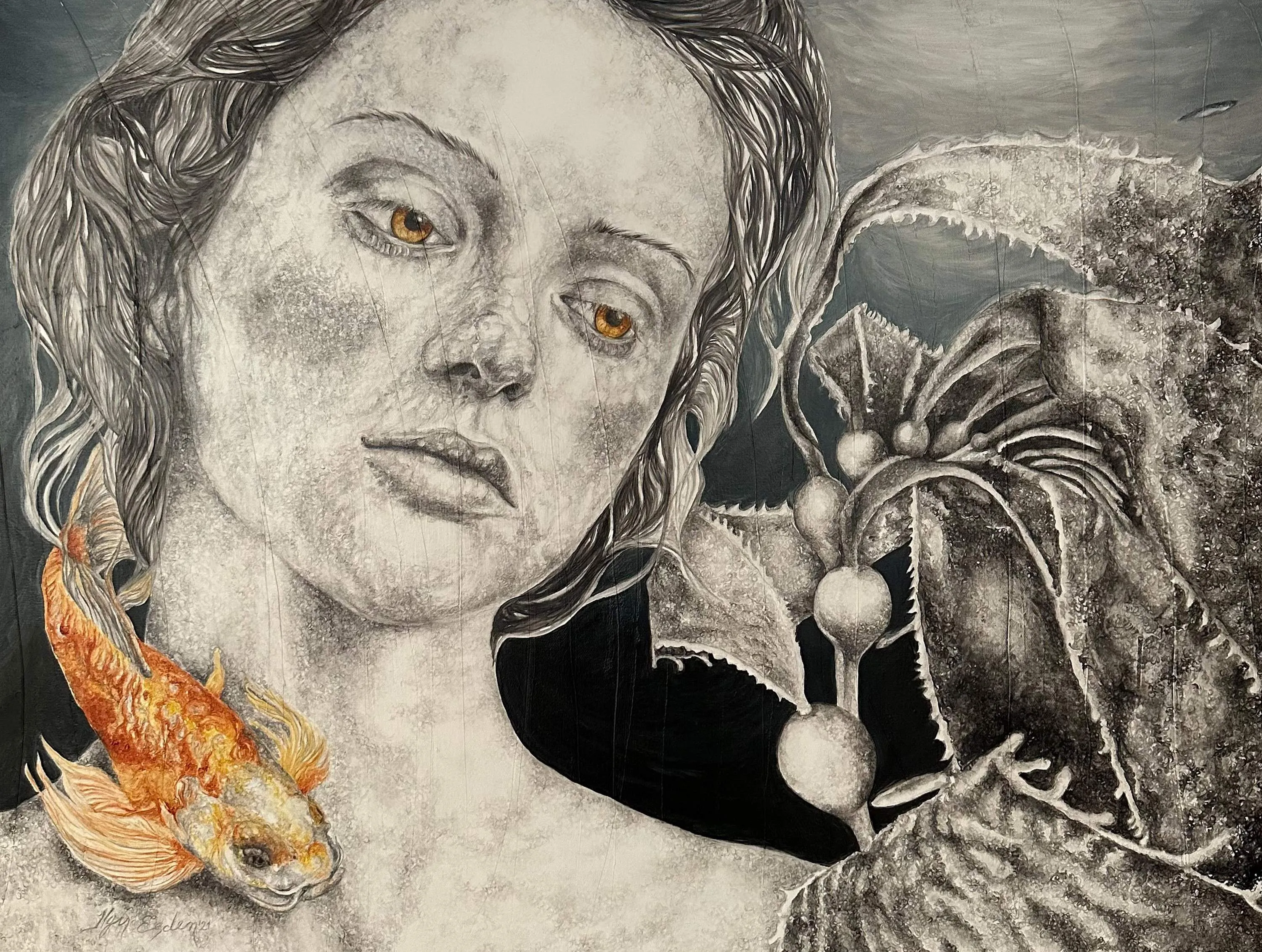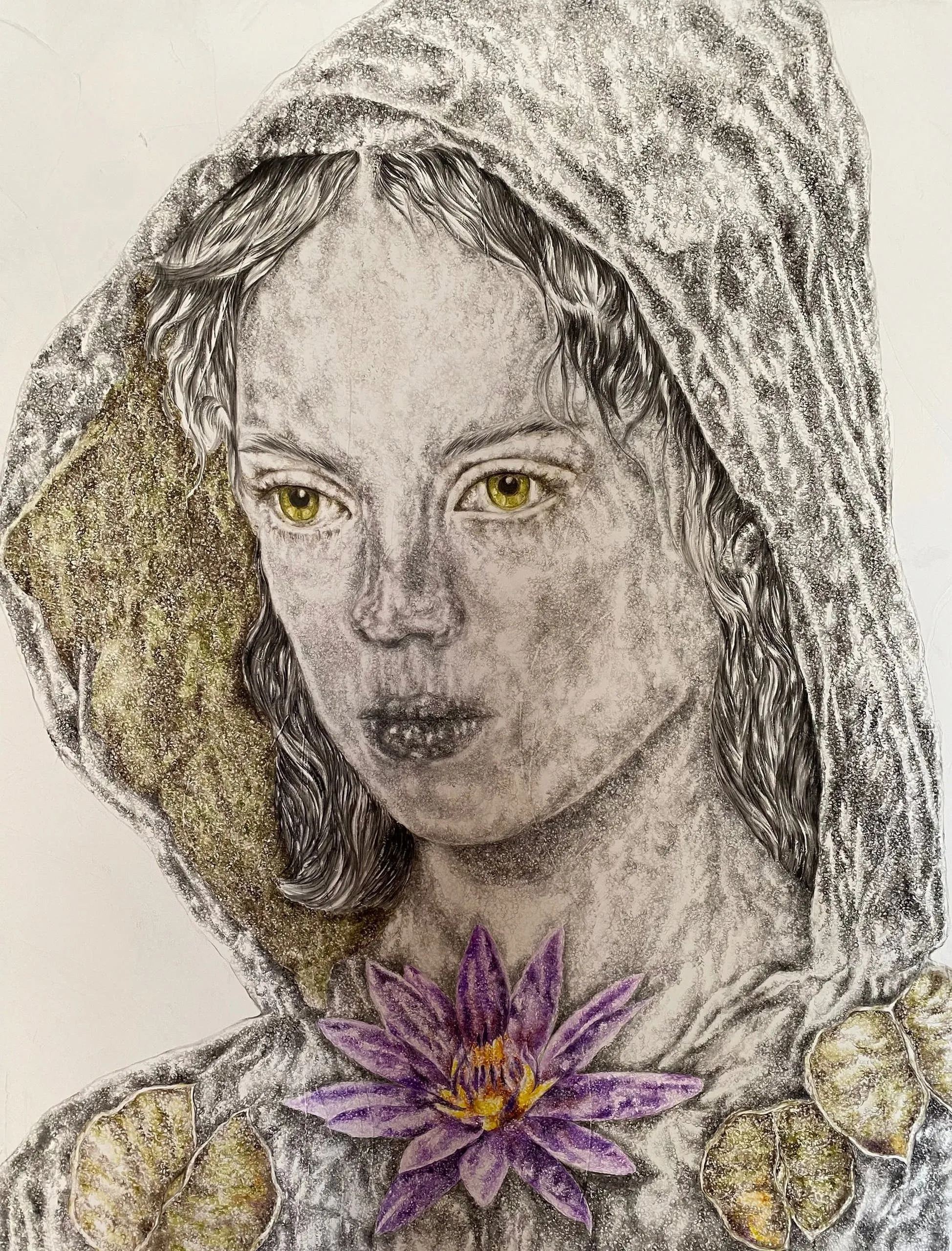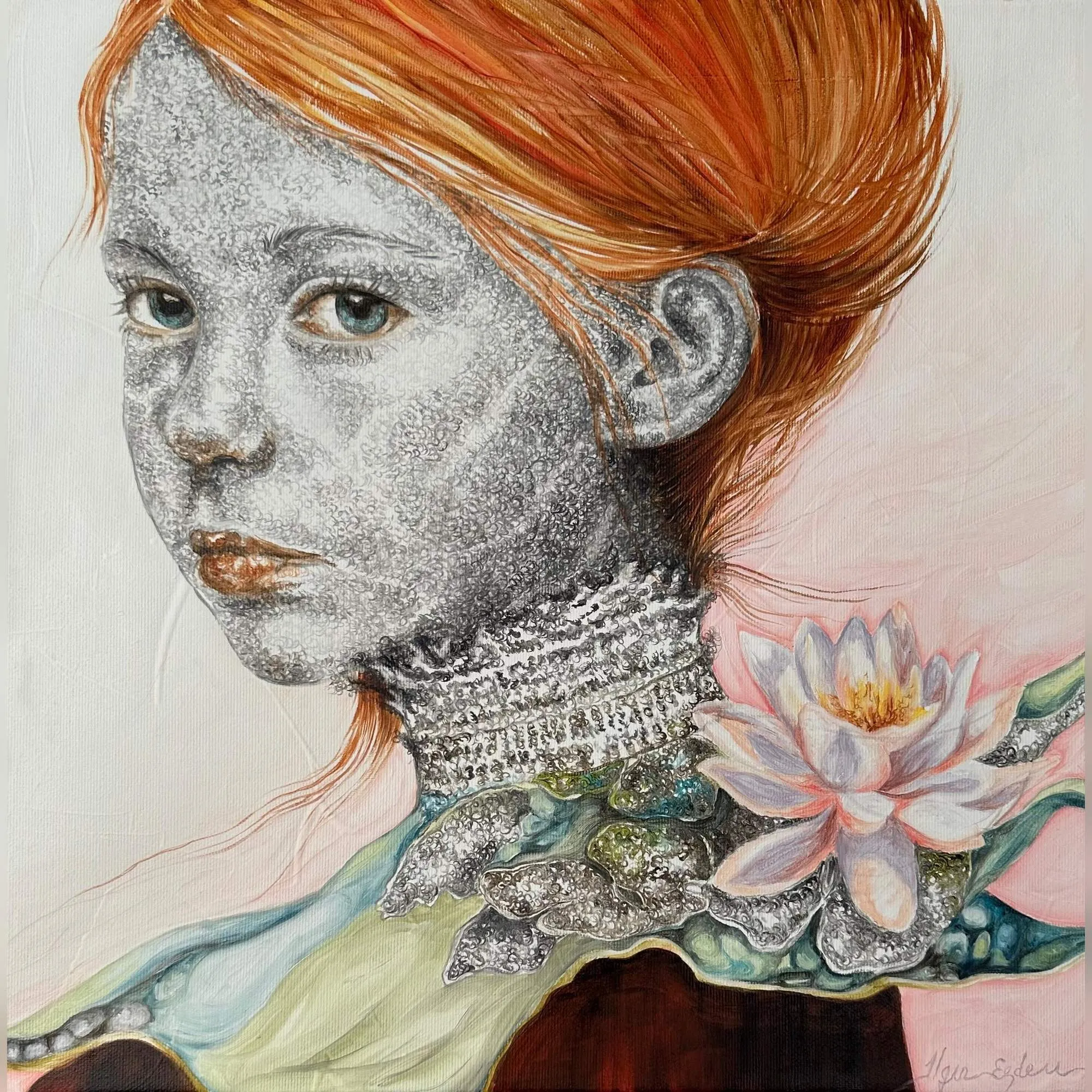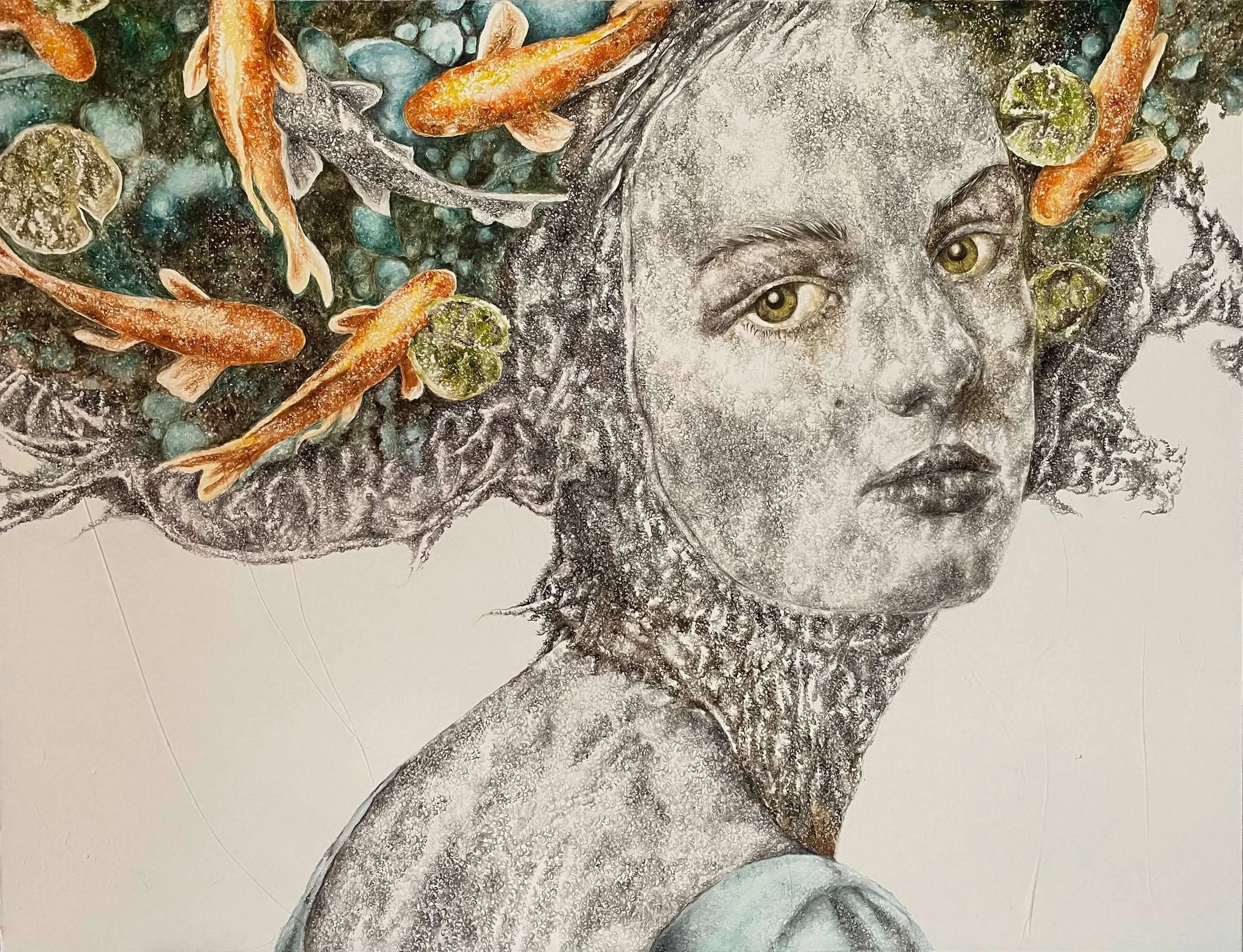 ‘Only through form and pattern… As if moving within its own tranquility, silence can be reached.’ As TS Eliot says, Ilgın Erdem’s figures also reach a quiet stillness, sanctifying innocence and peace, drawing the viewer into the depth within her painting. Her art is full of innocence. She searches for the silence of lost innocence; the silence of silenced women, the stillness between dream and reality. Her women call the viewer into an inner dialogue. Freed from the burdens of the world, they seem to seek inner peace and tranquility through being ‘here and now.’ And their silence is the shadow of the pain in their souls, captured in their expressions.