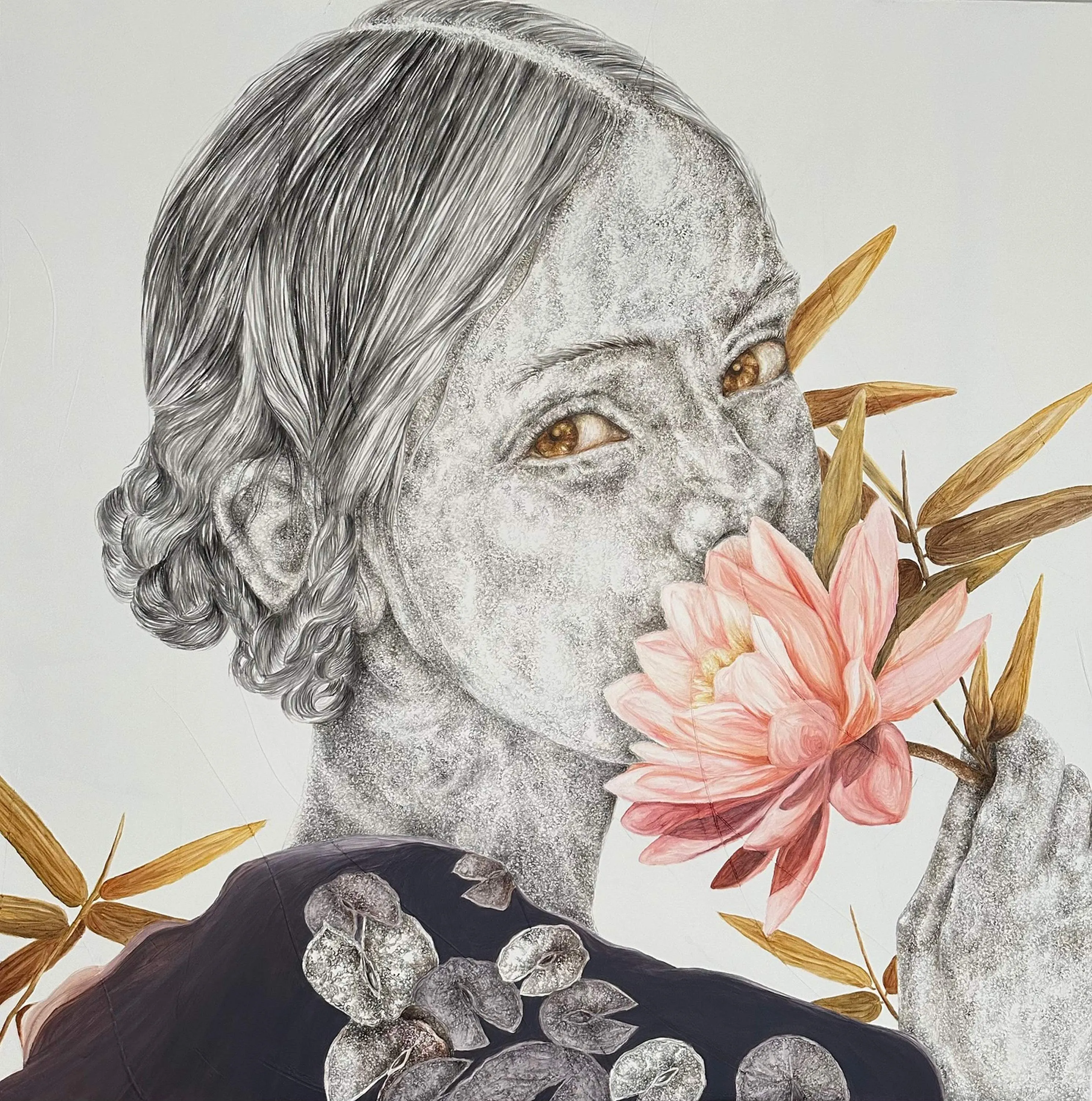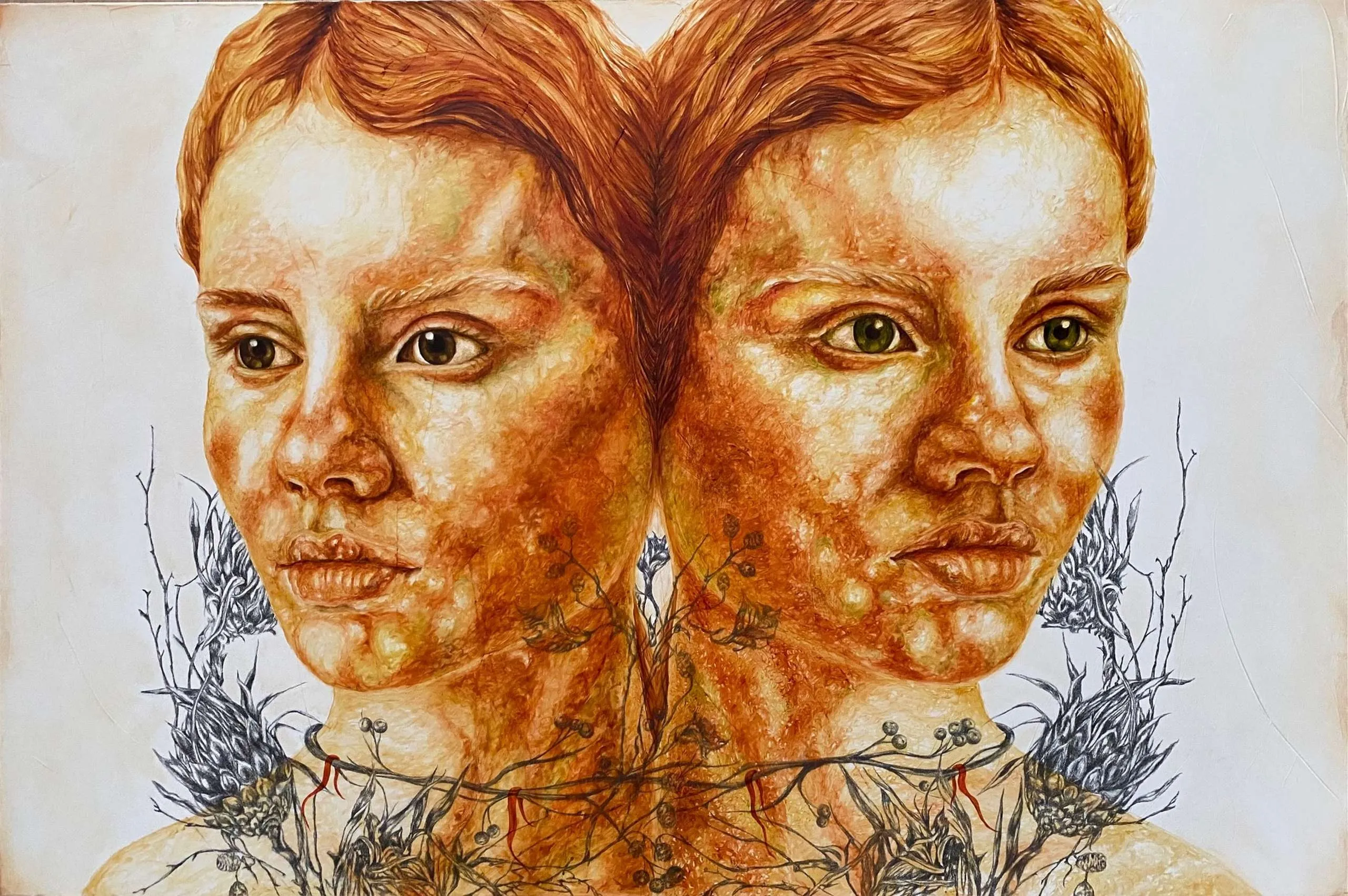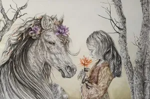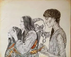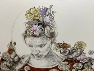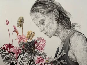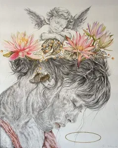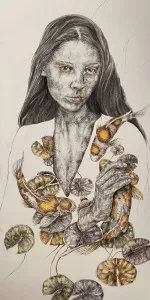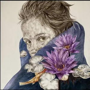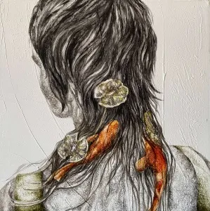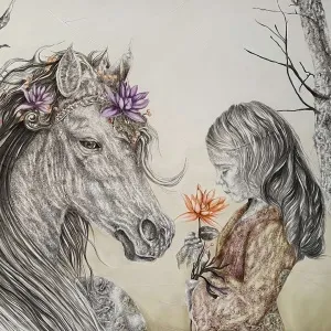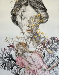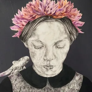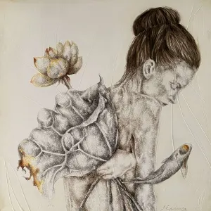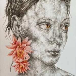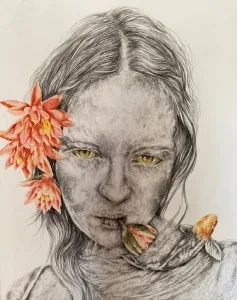 These paintings are a collection of pure and innocent moments. With deep sensitivity towards lines and colors, she portrays the innocence of the figures through the sadness of wildflowers.” - İbrahim Karaoğlu
