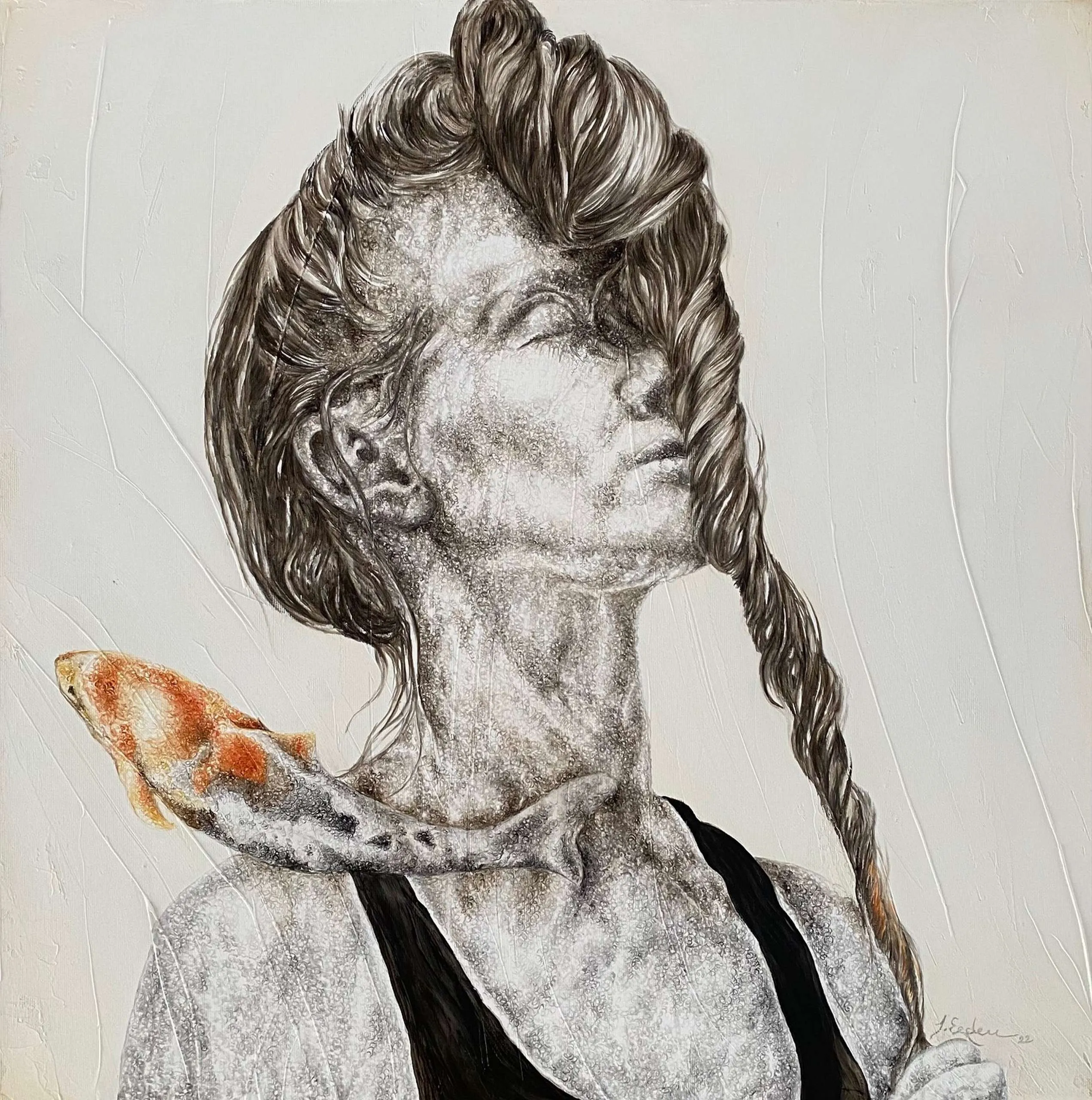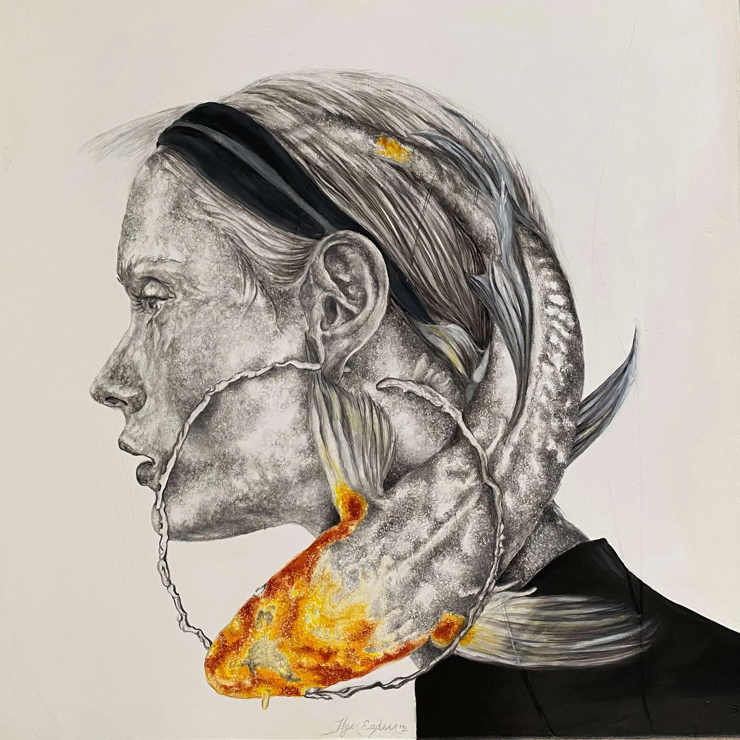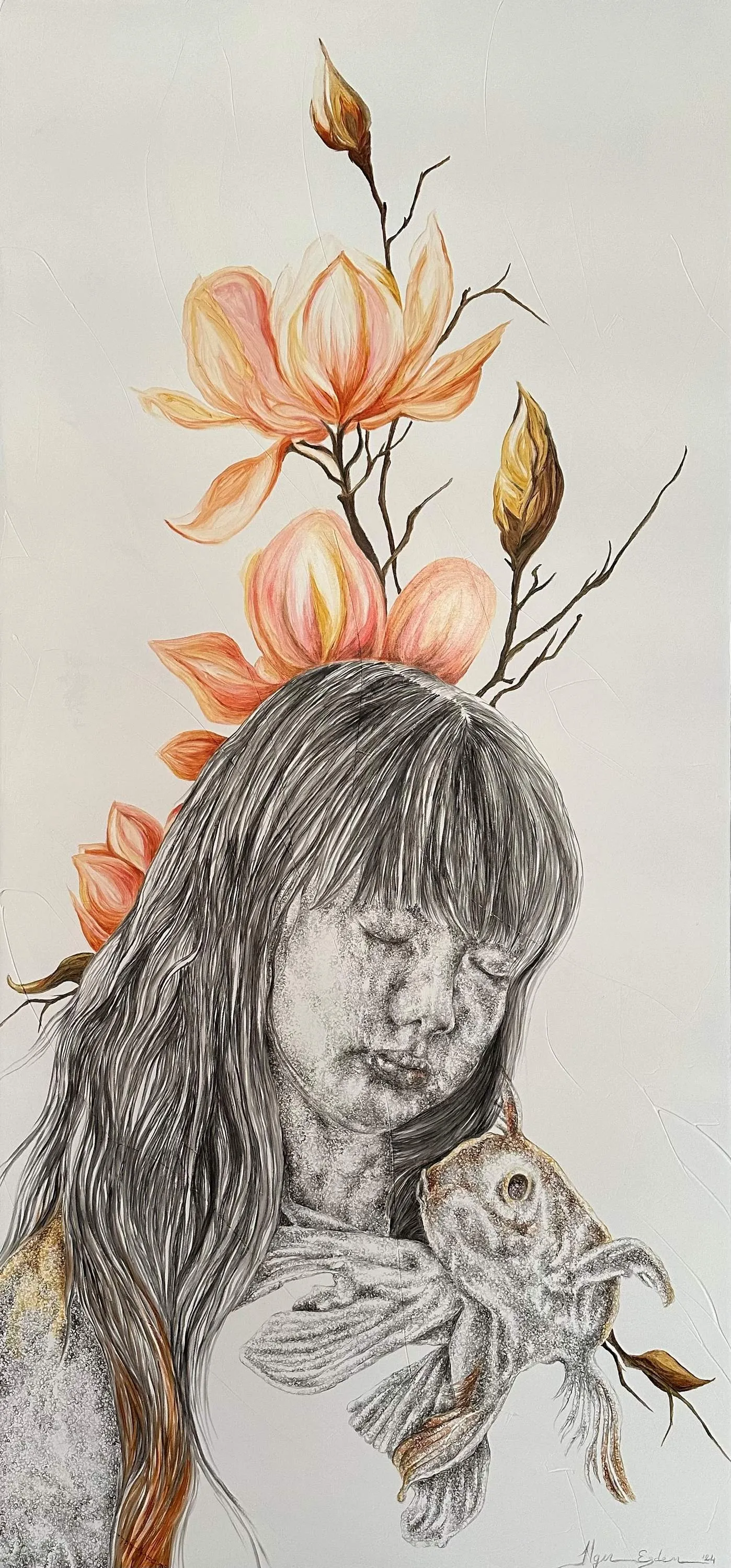 Each of her paintings is a record of intense emotions, leading us into Erdem’s unique world. Her main theme is the pure, innocent states of people when their voices are lost and unheard. She adds innocence to each of her figures: questioning our distance from the lost innocence as we move away from our childhood.
