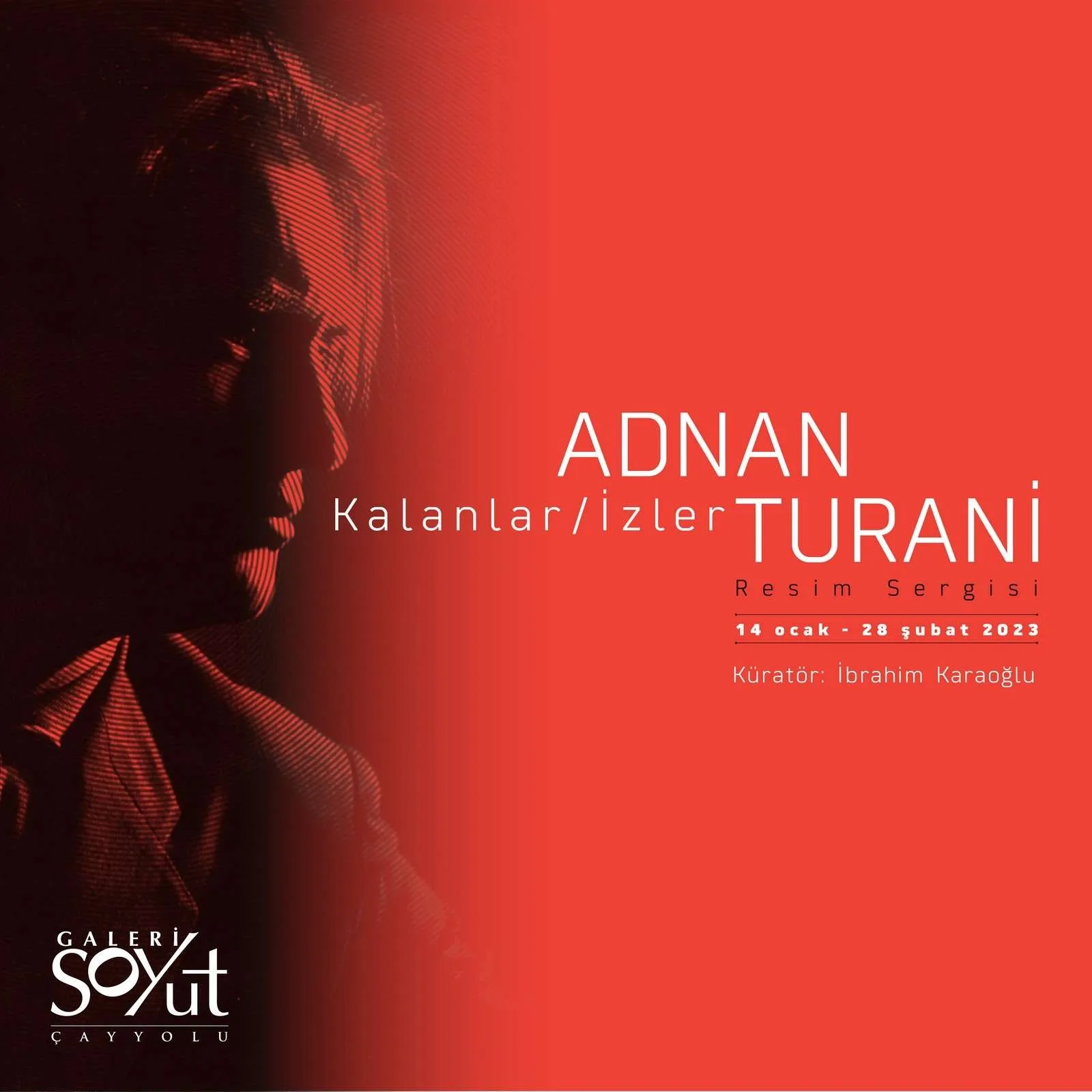 Galeri Soyut, 14 Ocak – 28 Şubat 2023 tarihleri arasında, Çayyolu / Tüm salonlarda, Adnan Turani’nin “Kalanlar/İzler” kişisel resim sergisine ev sahipliği yapıyor. Küratörlüğünü İbrahim Karaoğlu’nun yaptığı bu özel proje sergisinde Çağdaş Türk Resim Sanatında iz bırakan önemli ustalardan Adnan Turani’nin 1943 – 2016 yılları arasında ürettiği, yağlı boya, desen ve baskılardan oluşan eserler yer almaktadır.