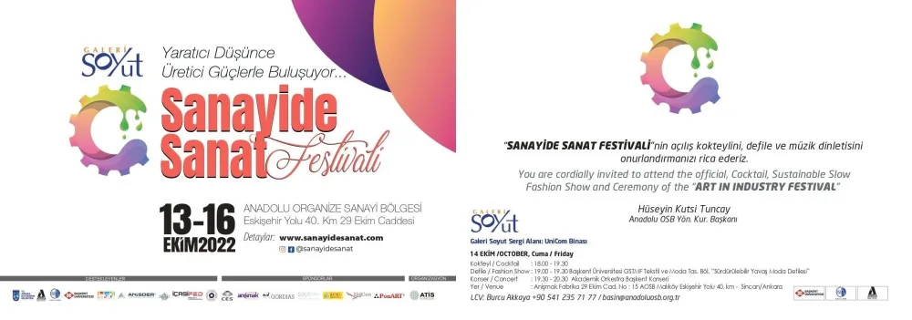 Galeri Soyut, 14 – 16 Ekim 2022 tarihleri arasında, Anadolu Organize Sanayi Bölgesi / Temelli, UniCom Binasında gerçekleşecek olan “Sanayide Sanat” Festivaline 35 sanatçı ile katılıyor.
