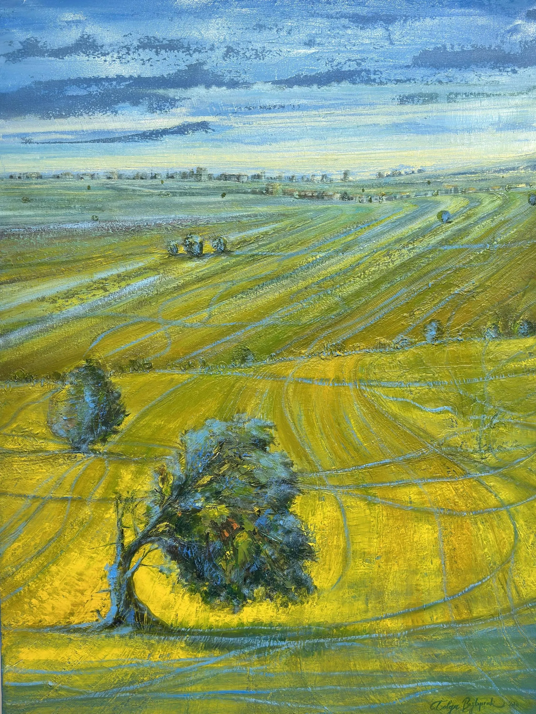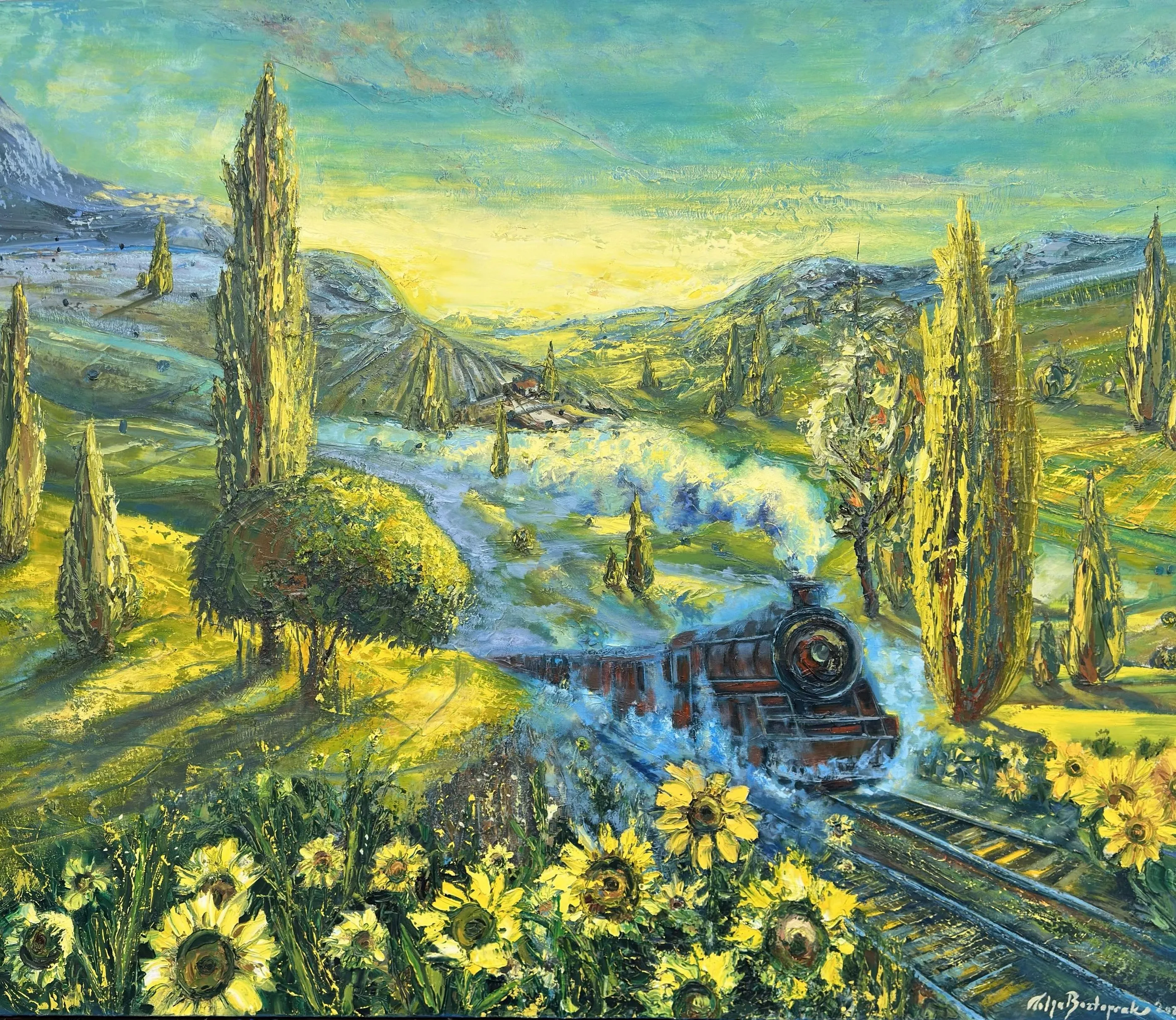 Boztoprak’ın renk kullanımı ve fırça dili, bu arayışı duygusal bir zemine taşır. Canlı sarılar, derin maviler, yeşilin ve toprağın farklı tonları; doğanın yalnızca fiziksel değil, ruhsal bir alan olarak da ele alındığını gösterir. Biçimler yer yer sadeleşir, yer yer ritmik bir tekrar kazanır. Mekân algısı net bir gerçekliğe işaret etmekten çok, düşsel ve zamansız bir atmosfere yönelir. Bu atmosfer, izleyiciyi belirli bir yere değil; bir hâle, bir duyguya davet eder.
